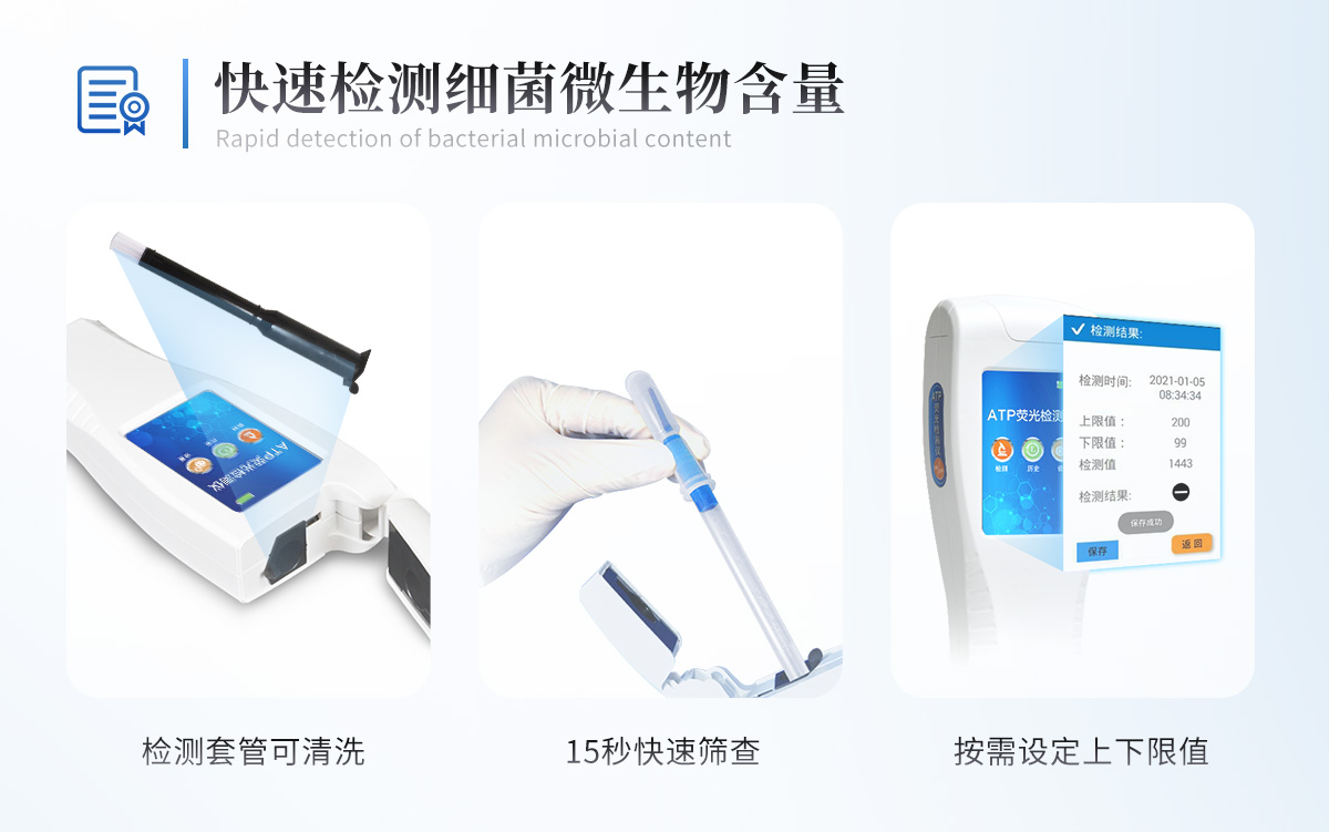 實用性 —— 可根據環境檢測需求設定上下限值,做到數據快速評估預警,表面潔凈度快速篩查。 | 靈敏度高 —— *************** | 速度快 —— 常規培養法18-24h以上,而ATP只需要十幾秒鐘 . | 可行性 —— 微生物數量與微生物體內所含ATP有明確的相關性。 通過檢測ATP含量,可間接得出反應中微生物數量 | 可操作性 —— 傳統培養方法需要在實驗室由經過培訓的技術人員進行操作;而ATP快速潔凈度檢測操作非常簡便,只需簡單的培訓即可由一般工作人員進行現場操作。 | 體驗更好 —— 試子套管采用插拔式靈活設計,可定期清洗長期使用,延長儀器壽命。 |
