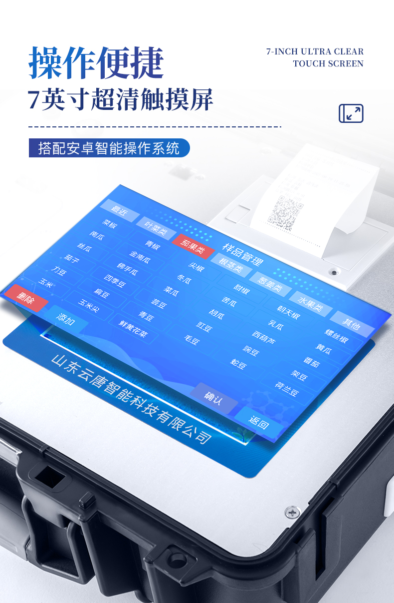 | 機(jī)箱采用工業(yè)級(jí)ABS工程塑料箱,方便攜帶,穩(wěn)固耐用,便于流動(dòng)測(cè)試。 | 智能操作系統(tǒng),采用更加人性化操作,主控采用多核處理器,主頻1.88Ghz,運(yùn)轉(zhuǎn)速度更快速,穩(wěn)定性更強(qiáng)。 | 自動(dòng)判斷樣品是否合格,檢測(cè)結(jié)果更加直觀(guān)。 | 儀器具有100多種蔬菜名稱(chēng)菜單庫(kù),分類(lèi)管理,并可按需添加或刪除蔬菜名,編輯蔬菜名稱(chēng),可直接打印出蔬菜名稱(chēng)。 | 檢測(cè)通道:18個(gè)檢測(cè)通道,可以同時(shí)測(cè)試多個(gè)樣品,循環(huán)檢測(cè),即放即檢,每個(gè)樣品由程序控制分別獨(dú)立工作,不會(huì)互相干擾。 | 儀器具有wifi聯(lián)網(wǎng)功能,可將數(shù)據(jù)快速上傳電腦,進(jìn)行數(shù)據(jù)管理與統(tǒng)計(jì),4G信號(hào)GPRS遠(yuǎn)傳功能,可插手機(jī)卡實(shí)現(xiàn)數(shù)據(jù)遠(yuǎn)傳平臺(tái),。 | 顯示方式:7英寸高靈敏真彩觸摸屏顯示,人性化中文操作界面,讀數(shù)直觀(guān)、簡(jiǎn)單。 | 打印機(jī)采用串口5v打印,可選擇手動(dòng)打印或者自動(dòng)打印,三分鐘出打印結(jié)果,打印格式為檢測(cè)人姓名、吸光度差值、檢測(cè)時(shí)間、檢測(cè)機(jī)構(gòu)、樣品名稱(chēng)及結(jié)果判定。 | 光源采用進(jìn)口超高亮發(fā)光二極管,具有低功耗、高精度、穩(wěn)定性強(qiáng)、光源可控可以關(guān)掉不使用的光源,響應(yīng)速度快等優(yōu)點(diǎn)。 | 智能恒流穩(wěn)壓,光強(qiáng)自動(dòng)校準(zhǔn),長(zhǎng)時(shí)間連續(xù)工作光源無(wú)溫漂現(xiàn)象。 | 采用USB2.0接口設(shè)計(jì),方便數(shù)據(jù)的存貯和移動(dòng),并可隨時(shí)與計(jì)算機(jī)直接相連,并且可用計(jì)算機(jī)控制儀器。實(shí)現(xiàn)數(shù)據(jù)查詢(xún)、瀏覽、分析、統(tǒng)計(jì)、打印等。 | 智能化程度高,儀器具有自檢功能:具有開(kāi)機(jī)自檢和調(diào)零功能,具有自動(dòng)檢測(cè)重復(fù)性功能 | 儀器具有自身保護(hù)功能,可設(shè)置用戶(hù)名及密碼,防止非工作人員操作等。 | 采用DC12v直流供電,安全系統(tǒng)更高,并且配備6A鋰電池充電器。 | 儀器具有重新校準(zhǔn)、鎖定、恢復(fù)出廠(chǎng)設(shè)置功能。 |