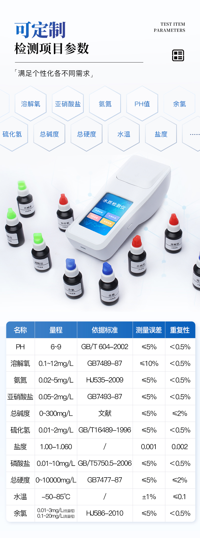 PH、溶解氧、氨氮、亞硝酸鹽、硫化氫、總堿度、檢測指標(biāo)等