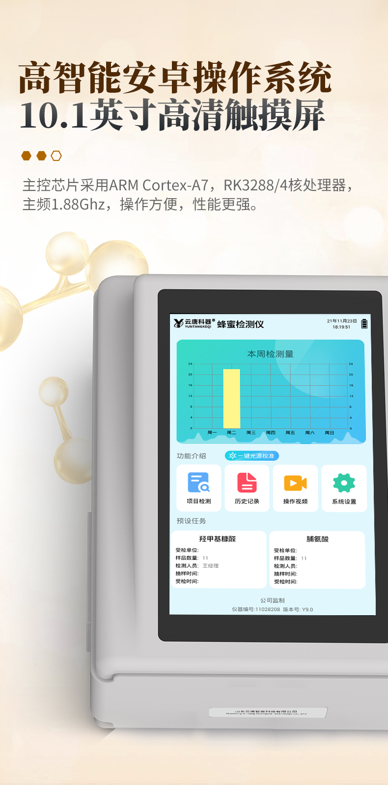 山東云唐智能科技有限公司生產的蜂蜜檢測儀為集成化食品安全快速檢測分析設備,采用手提箱式一體化設計,可檢測體現各類蜂蜜品質的蔗糖、還原糖(葡萄糖和果糖)、羥甲基糠醛、農藥殘留、獸藥殘留、重金屬等項目定性定量檢測。