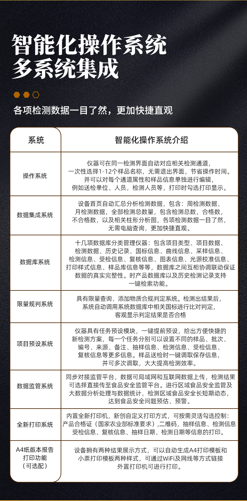 1、儀器采用手提一體化系統檢測技術,將分光光度模塊、膠體金檢測模塊、新型農殘檢測模塊、數字化管理模塊、無線通訊模塊高度集成于一體,支持檢測200種食品安全檢測項目,同時預留升級檢測方法。