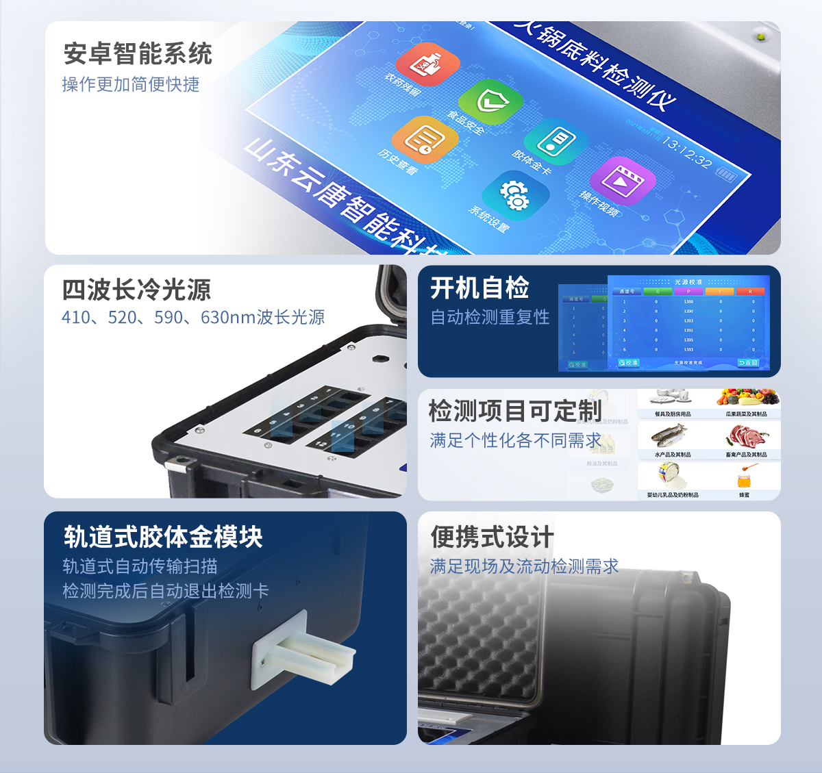 可現場快速檢測底料中非食用化學物質、濫用食品添加劑、農藥殘留、獸藥殘留、重金屬、抗生素類殘留、激素類殘留、毒素類殘留、化學類殘留等多項目的快速定性定量檢測。如底料中的山梨酸鉀、苯甲酸、甜蜜素、安賽蜜、黃曲霉B1等快速檢測。 該多功火鍋底料檢測儀為集成化食品安全快速檢測分析設備,廣泛應用于食藥監局、衛生部門、底料加工、工商執法等單位使用。