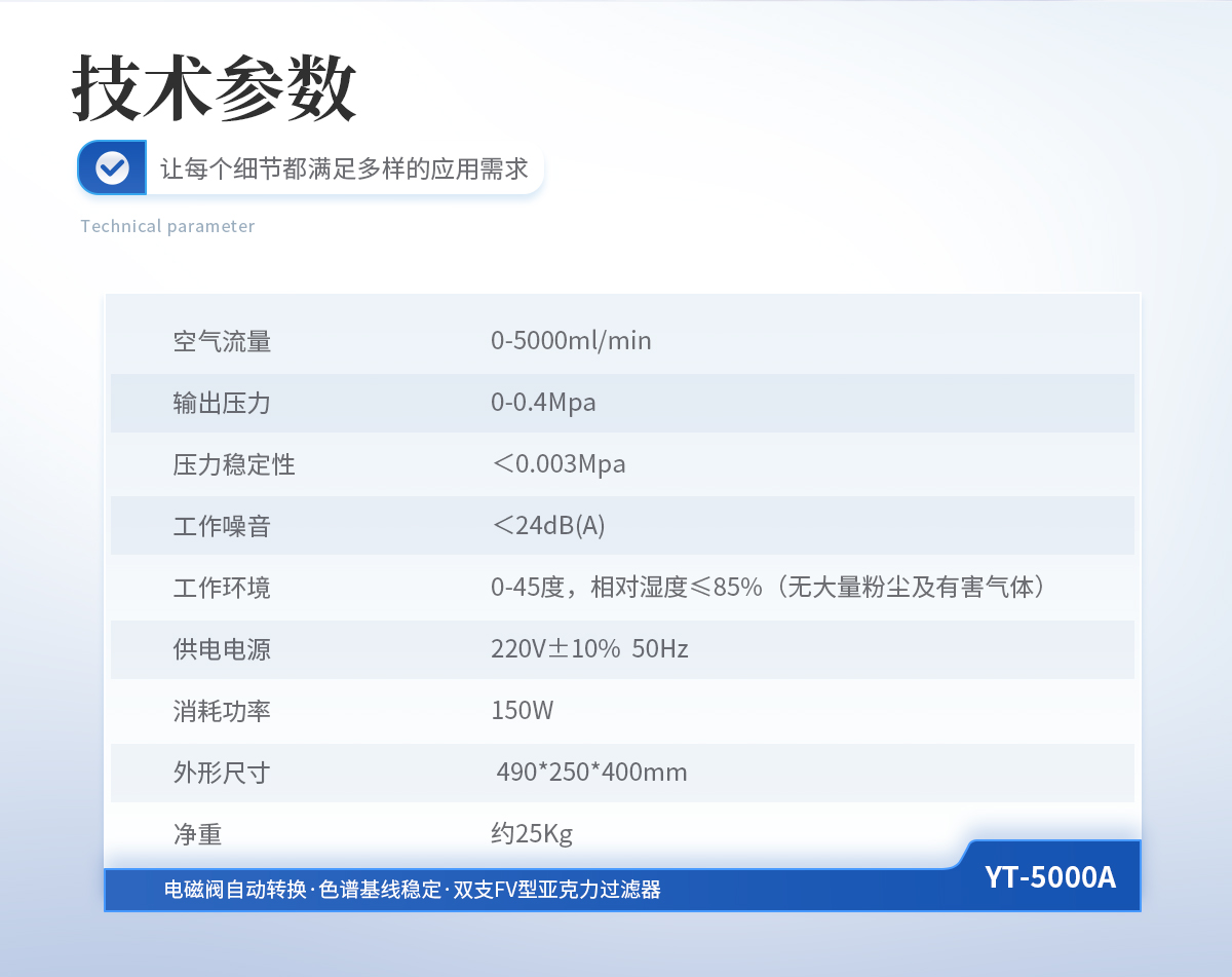 1、空氣流量: 0-5000ml/min | 2、輸出壓力: 0-0.4Mpa | 3、壓力穩定性:<0.003Mpa | 4、工作噪音: <24dB(A) | 5、工作環境: 0-45度,相對濕度≤85%(無大量粉塵及有害氣體) | 6、供電電源: 220V±10% 50Hz | 7、消耗功率: 150W | 8、外形尺寸: 490*250*400mm | 9、凈重: 約25Kg |