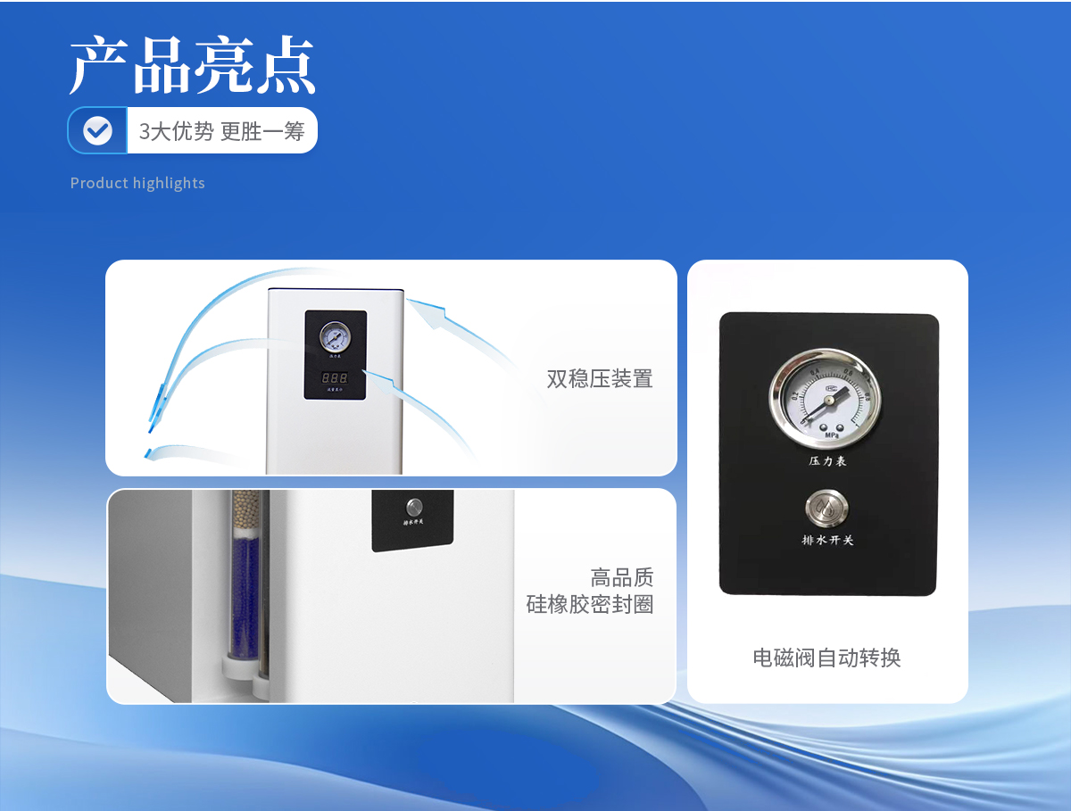 1、雙穩壓裝置,確保高精度穩壓條件下氣體流量的穩定性。 | 2、電磁閥自動轉換,徹底杜絕了電磁閥在自動放水時產生的連續噪音,實現放水、轉換一體化。 | 3、儀器內部采用硅橡膠圈,含硫量低有效提高氣體質量,保證色譜基線穩定。 | 4、體積小,雙支FV型亞克力過濾器,耐壓高,不會因工作環境及腐蝕氣體的影響,導致過濾管變形,開裂而產生漏氣現象,可持久使用,一勞永逸。 |