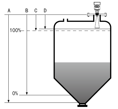 注:使用雷達水位計時,務必保證**液位不能進入測量盲區(圖中D所示區域)。