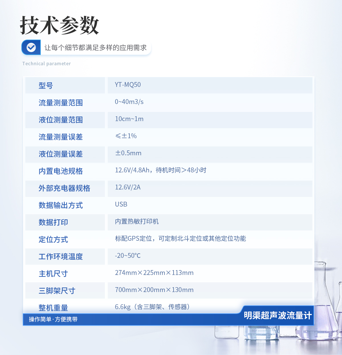 流量測量范圍 0~40m3/s 流量測量頻次 3次/秒 液位測量誤差 ≤0.5mm 流量測量誤差 ≤±1% 液位分辨率 0.1mm 探測距離 標配1米,可選配2米 信號輸出方式 USB 工作環境濕度 ≤85% 工作環境溫度 -20℃~+50℃v 工作電源 AC220V ±15% 內置電池 16.8V/2.6Ah 電池供電連續工作時間 >72 小時 外形尺寸 270mm×215mm×105mm 整機重量 2.4Kg