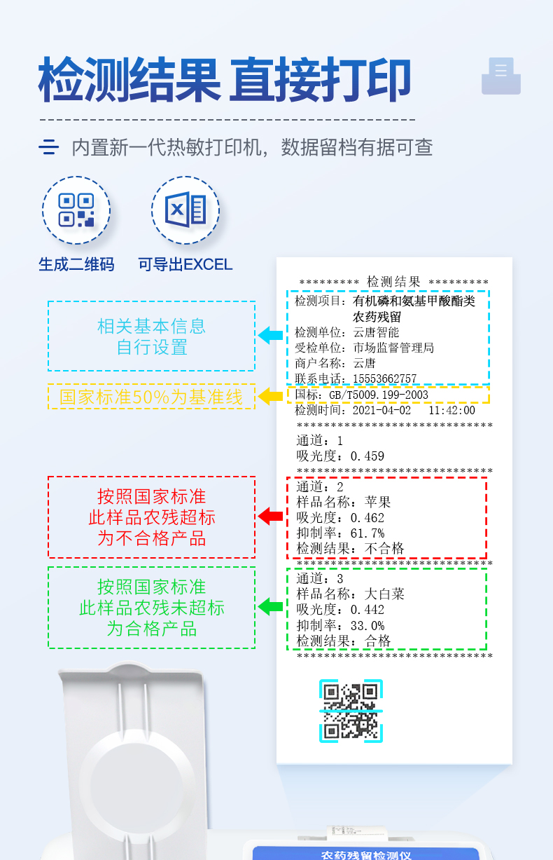 安卓智能操作系統(tǒng),采用更加**和人性化操作,儀器具有無線聯(lián)網(wǎng)上傳功能,快速上傳數(shù)據(jù),進(jìn)行數(shù)據(jù)統(tǒng)計和分析。 | 智能化程度高,儀器具有自檢功能:具有開機(jī)自檢和調(diào)零功能,具有自動檢測重復(fù)性功能;同時,檢測完成可自動打印檢測報告和二維碼。手機(jī)掃碼可顯示出詳細(xì)檢測信息。 | 儀器帶有監(jiān)管平臺,數(shù)據(jù)可局域網(wǎng)和互聯(lián)網(wǎng)數(shù)據(jù)上傳,檢測結(jié)果直接傳至食品安全監(jiān)管平臺。進(jìn)行區(qū)域食品安全監(jiān)管及大數(shù)據(jù)分析處理與數(shù)據(jù)統(tǒng)計,檢測區(qū)域食品安全長短期動態(tài),達(dá)到食品安全問題預(yù)估、預(yù)警 。 | 樣品處理簡單省力,整體操作快速、安全、便捷。 | 儀器具有自身保護(hù)功能,可設(shè)置用戶名及密碼,防止非工作人員操作等。 | 內(nèi)置強(qiáng)大的數(shù)據(jù)庫,可在儀器上直接選擇樣品名稱、檢測指標(biāo)、送檢單位等信息,也可在儀器上直接編輯錄入樣品名稱、檢測指標(biāo)、送檢單位等信息并保存進(jìn)樣品數(shù)據(jù)庫,方便后期操作調(diào)取使用。 | 儀器具有重新校準(zhǔn)、鎖定、恢復(fù)出廠設(shè)置功能。 |