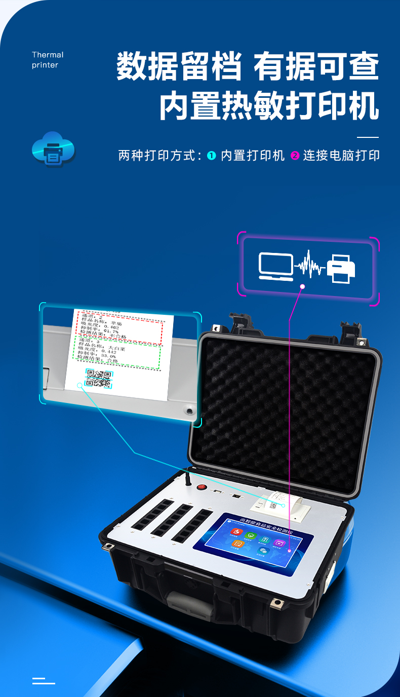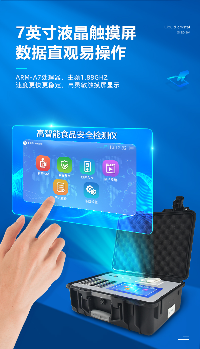 儀器采用手提式一體化系統檢測技術,將分光光度模塊、膠體金檢測模塊、新型農殘檢測模塊、數字化管理模塊、無線通訊模塊高度集成于一體,支持檢測200種食品安全檢測項目,同時預留升級檢測方法。 | 儀器檢測模塊標準化、智能化,檢測項目可隨意自由組合。檢測箱體內置多個標準檢測單元,檢測模塊可以調整配置。 | 顯示屏幕:儀器采用10.1英寸液晶觸摸屏顯,搭配運行安卓智能操作系統,主控芯片采用ARM Cortex-A7,RK3288/4核處理器,主頻1.88Ghz,運轉速度更快速,性能更強。 | 檢測通道:≥12通道;采用精密旋轉比色池設計,使用光源芯片一致,可以解決各通道間由于光源芯片不同帶來的檢測結果誤差問題,檢測結果更加精準,1-12通道間誤差0.1%,***:**202022821055.2。 | 儀器光源:高精度進口四波長冷光源,每個通道均配置 410、520、590、630nm 波長光源,標配**的光路切換裝置,專利光路切換功能可實現*多64波長,并且所有檢測項目可實現所有通道同時檢測。 | 設備具備開機自動校準及一鍵校準功能,確保檢測數據結果準確。 | 通訊接口:配備無線通信模塊、4G(APN)通訊模塊、藍牙傳輸,同時具有雙USB接口以及RJ45網線接口,可以多方式實現數據保存及數據傳輸。 | 存儲方式:支持U盤存儲,標準USB接口,免驅動安裝。檢測結果存儲容量20萬條以上,可生成Excel表格進行拷貝,并具有登錄保護功能。 | 智能化操作系統: 操作系統:可在同一檢測界面自動對應相關檢測通道,一次性選擇1-12個樣品名稱,無需退出界面,節(jié)省操作時間。檢測通道可以分別打開與關閉并對檢測通道屬性和樣品信息進行編輯,例如送檢單位、人員,檢測人員等,打印時一并顯示。 數據集成系統:設備首頁自動統計檢測數據,包含:周檢測數據、月檢測數據,全部檢測總數量,均包含檢測總數,合格數,不合格數,以及相關柱形分析圖,對各項檢測數據清晰掌握,無需電腦查詢,更加快捷直觀。 數據庫系統:具有多品類多種類樣品菜單功能,并且構建了完善的檢索、修訂功能。食品庫涵蓋多種菜單庫100多種蔬菜名稱,可按需添加或刪除、編輯蔬菜名稱;不同的檢測通道可同時檢測不同的樣品,產品數據庫以及歷史檢測記錄支持一鍵檢索功能。 限量規(guī)判系統:具有限量查詢、添加物質合規(guī)判定系統。檢測出結果后,系統自動調用系統數據庫中相關國標進行比對判定,客觀顯示判定結果是否合格。 項目預設系統:儀器具有任務預設模塊,可在樣品送檢前提前預設樣品名稱、檢測指標、送檢單位、檢測單位等信息,樣品送檢時一鍵調取保存信息,并可多次調取,大大提高檢測效率。 數據監(jiān)管系統:同步對接監(jiān)管平臺,數據可局域網和互聯網數據上傳,檢測結果可選擇直接傳至食品安全監(jiān)管平臺。進行區(qū)域食品安全監(jiān)管及大數據分析處理與數據統計,檢測區(qū)域食品安全長短期動態(tài),達到食品安全問題預估、預警。 自定義打印系統:內置熱敏打印機;系統打印格式多樣化,產品合格證(國家農業(yè)部標準要求),二維碼,抽樣信息、檢測信息,受檢信息、復核信息、抽樣日期、檢測日期等信息結果,可按實際需求自行設置開啟或關閉,并完成打印。 | 供電模式:儀器主機采用一體化防水、抗壓、防撞擊、防腐蝕機體設計,可直接使用交流電源;內置6ah大容量充電鋰電池,可連續(xù)使用8小時以上,滿足脫電情況下檢測需求。 | 膠體金檢測模塊: 采用雙通道CMOS成像處理技術及膠體金免疫層析技術,可同時讀取雙膠體金卡數據,自動采集、處理分析,將檢測結果顯示,并可根據參考限值自動判斷檢測結果,可檢測常見的獸藥殘留、生物毒素、抗生素、違禁添加物等。 探測技術:CMOS成像探測; 檢測通道:3通道,可同時讀取3個膠體金卡數據; 檢測方式:消線法和比色法; 顯示模式:陰性或陽性; 曲線形式:軌道式自動傳輸掃描方式,可實時顯示金標卡圖像,系統自動分析并呈現出CT曲線圖,CT線自動識別,無需手動調整,完成檢測后自動退出檢測卡。兼容市場上其他金標卡,使用耗材不受限制。 | 儀器后期可根據實際使用需求按項目升級。 |