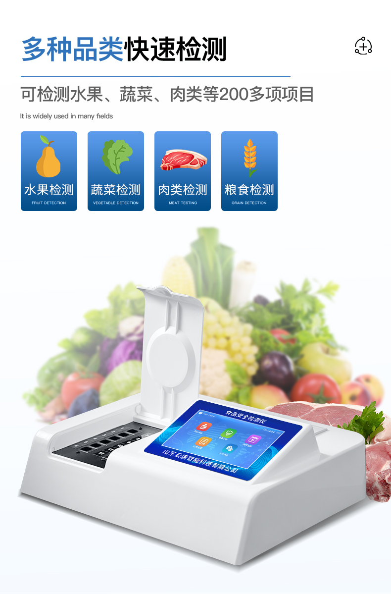 可快速檢測各類食品中的甲醛、吊白塊、二氧化硫、亞硝酸鹽、雙氧水、硼砂、農藥殘留、乳及乳制品中蛋白質、硝酸鹽、重金屬鉛的含量,儀器預留其他項目檢測程序和端口,根據日后需求可方便的自主增加檢測項目。