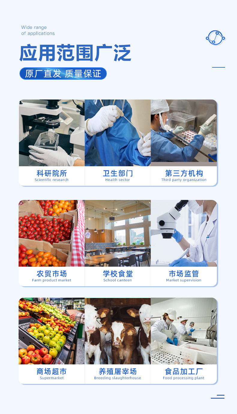 食品添加劑:二氧化硫、雙氧水、亞硝酸鹽、硝酸鹽、苯甲酸鈉、山梨酸、糖精鈉、甜蜜素、安賽蜜、硫酸鎂等 | 有毒有害物質:甲醛、吊白塊、硼砂、過氧化苯甲酰、溴酸鉀、羅丹明B、三聚氰胺、蘇丹紅等 | 瓜果蔬菜藥殘:農藥殘留(酶抑制率法) | 病害肉診斷:組胺、揮發性鹽基氮、肉制品酸價、水發產品中組胺 | 重金屬含量:鉛、鎘、鉻、汞、砷、錫、鎳、鋁等;食用油脂檢測:過氧化值、酸價、油脂丙二醛等。 | 食用油脂檢測::過氧化值、酸價等 | 瘦肉精激素類(獸藥):鹽酸克倫特羅、沙丁胺醇、萊克多巴胺、己烯雌酚等 | 抗生素殘留類(獸藥):四環素類、硝基呋喃類、磺胺類、β-興奮劑類、沙星類、磺胺類、喹諾酮類,甲砜霉素,氟苯尼考,金剛烷胺、替米考星、慶大霉素、林可霉素、鏈霉素、恩諾沙星、環丙沙星、頭孢啦啶、青霉素、阿莫西林等 | 真菌毒素類:食用油、糧食及飼料中黃曲霉毒素B1、奶中黃曲霉毒素M1、嘔吐毒素、玉米赤霉烯酮、赭曲霉毒素A等 | 水酒飲品分析:乳品及牛奶中蛋白質;酒中甲醇、乙醇、雜醇油;蜂蜜中果糖和葡萄糖、蔗糖、淀粉酶、酸度;水中氰化物、余氯,飲料中維C等 | 調味品成分:食醋的總酸、醬油的總酸、芝麻油純度、谷氨酸鈉、醬油氨基酸態氮、食鹽中亞鐵氰化鉀、食鹽中碘等 | 食用色素類:紅色色素(胭脂紅、莧菜紅、赤蘚紅、誘惑紅)、黃色色素(檸檬黃、日落黃)、藍色色素(亮藍)等 | 動物疫病類:豬藍耳病毒、豬瘟病毒、豬偽狂犬病毒、豬偽狂犬病毒gE蛋白、豬口蹄疫3ABC蛋白、豬口蹄疫病毒IgG、豬細小病毒、雞禽流感等 | 蜂蜜中:果糖和葡萄糖、蔗糖、淀粉酶、酸度等 | 水產品安全類:孔雀石綠、氯霉素、呋喃妥因、呋喃西林、呋喃它酮、呋喃唑酮等 |