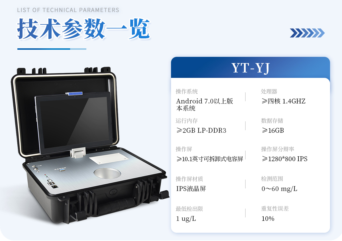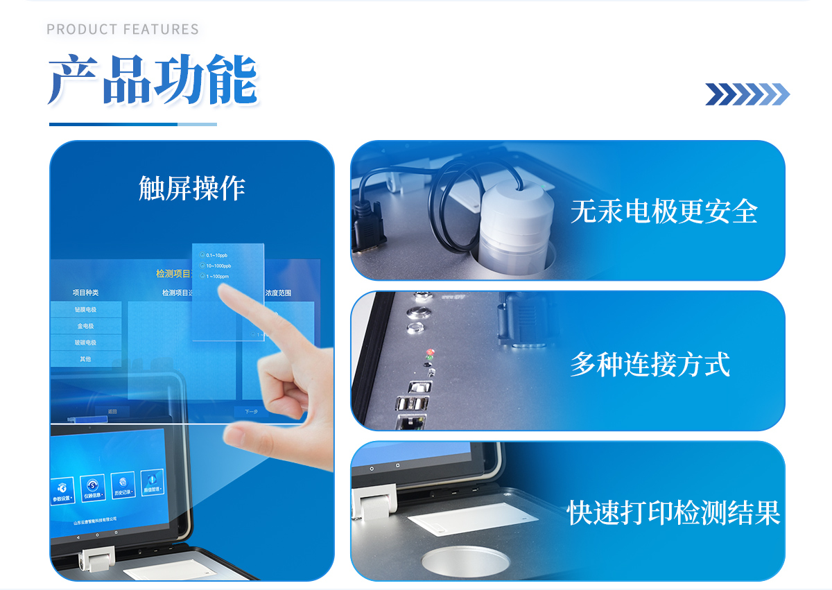 基本概述:便攜式箱體化一體機,采用防水、抗壓、防撞擊、防腐蝕箱體設計,滿足車載環境、無電源環境以及戶外檢測需求; | 主機:具備檢測功能、輔助功能、管理系統軟件、信息化管理功能,信息化實現數據雙向傳輸,能直接接收管理中心下發任務,并實時上報檢測結果至管理平臺; | 檢測技術:采用陽極溶出伏安法檢測技術; | 操作系統:Android 7.0以上版本系統; | 處理器:≥四核 1.4GHZ; | 運行內存:≥2GB LP-DDR3; | 數據存儲:≥16GB; | 通訊接口:包含兩個USB接口、網線接口、WIFI、藍牙、4G模塊,內置GPS接口,用于戶外或者其他移動檢測定位; | 指示燈:具有熱敏打印機工作指示燈,用于提示打印機工作狀態;具有電源充電指示燈,用于提示儀器充電狀態;具有無線藍牙對接狀態提示燈,用于提示操作平臺與儀器主機連接狀態;具有儀器工作狀態提示燈,用于提示儀器主機是否處于工作狀態; | 操作屏:≥10.1英寸可拆卸式電容屏設計,操作屏可以固定在儀器上,也可以取出單獨操作實現運程控制; | 操作屏分辯率:≥1280*800 IPS; | 操作屏材質: IPS液晶屏; | 輸入方式: 電容屏、觸摸輸入、支持多點觸控; | 采用無汞電極,安全無毒; | 模塊自帶攪拌功能,啟動后既可自動攪拌溶液。 | 檢測范圍: 0~60 mg/L ,**檢出限:1 ug/L; | 重復性誤差: 10%; | 具有自動尋峰功能,計算出樣品**數據; | 內置線性掃描、常規脈沖掃描、微分脈沖掃描; | 儀器現場取證功能: 儀器具有800萬以上防抖、自動對焦高清攝像頭,對檢測實樣進行現場拍照取證; | 電源控制器: 雙電源控制器,節省電量; | 運程控制:支持20米內無線藍牙控制儀器檢測,方便使用者沒在儀器身邊時也能完成項目檢測; | 打印: 內置微型熱敏打印機,可隨時打印檢測結果; | 電池:內置大容量可充電鋰電池,可連續工作5小時以上; | 箱體: 便攜一體化手提箱,箱體能防水,抗壓,整機重量小于5kg,攜帶方便; |