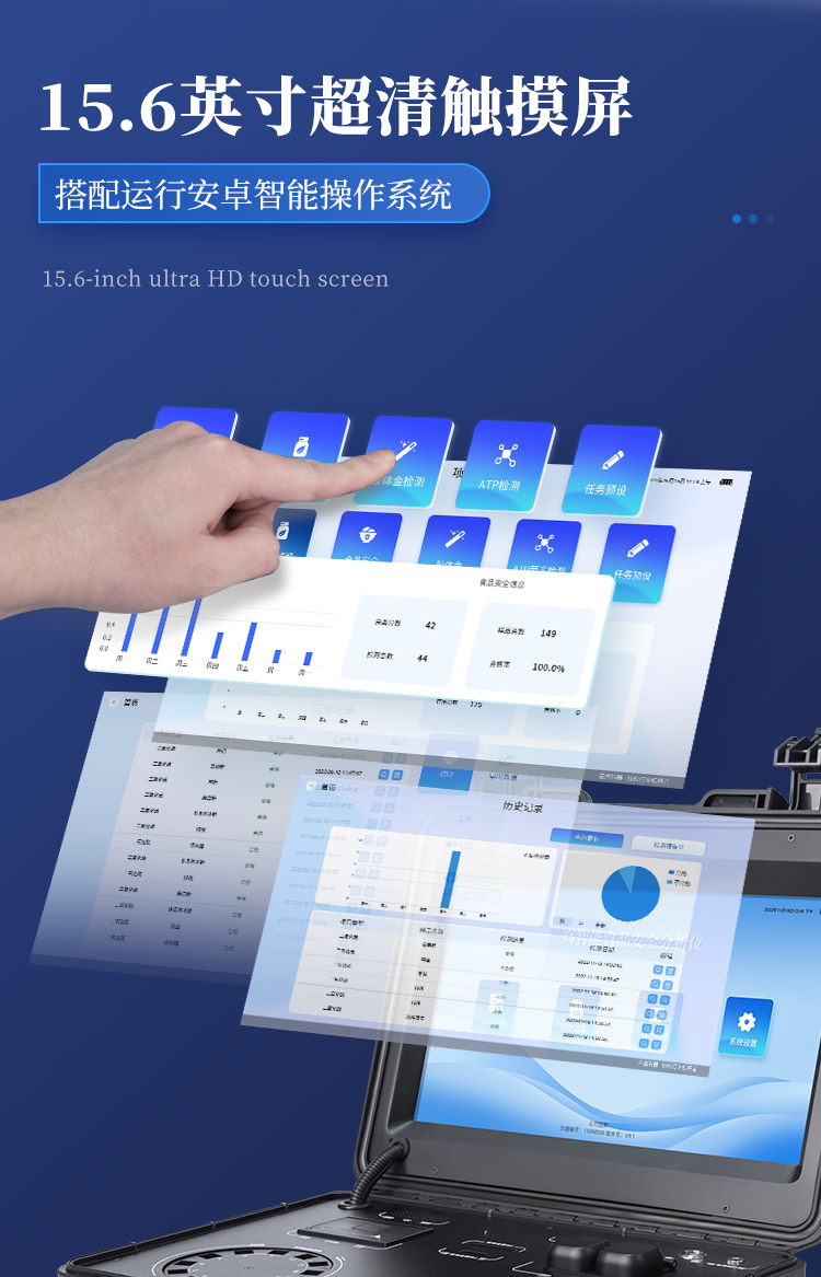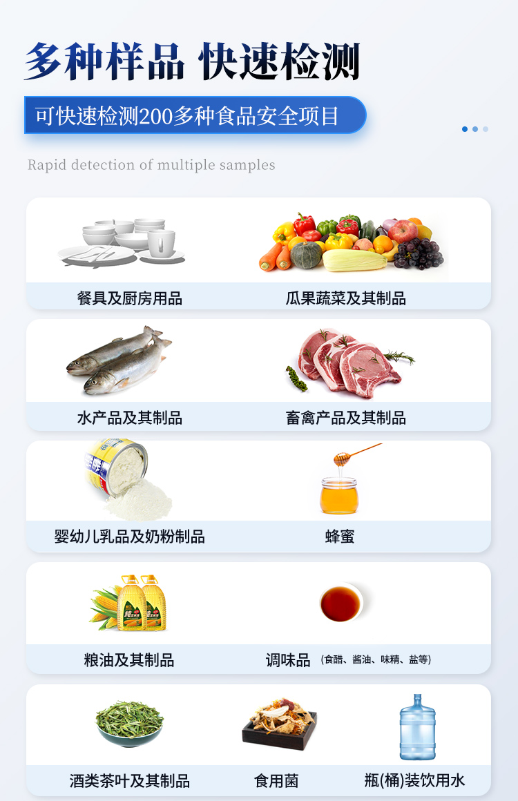 1、儀器采用手提一體化系統檢測技術,將分光光度模塊、數字化管理模塊、無線通訊模塊高度集成于一體,可支持檢測60種食品安全檢測項目,同時預留升級檢測方法。