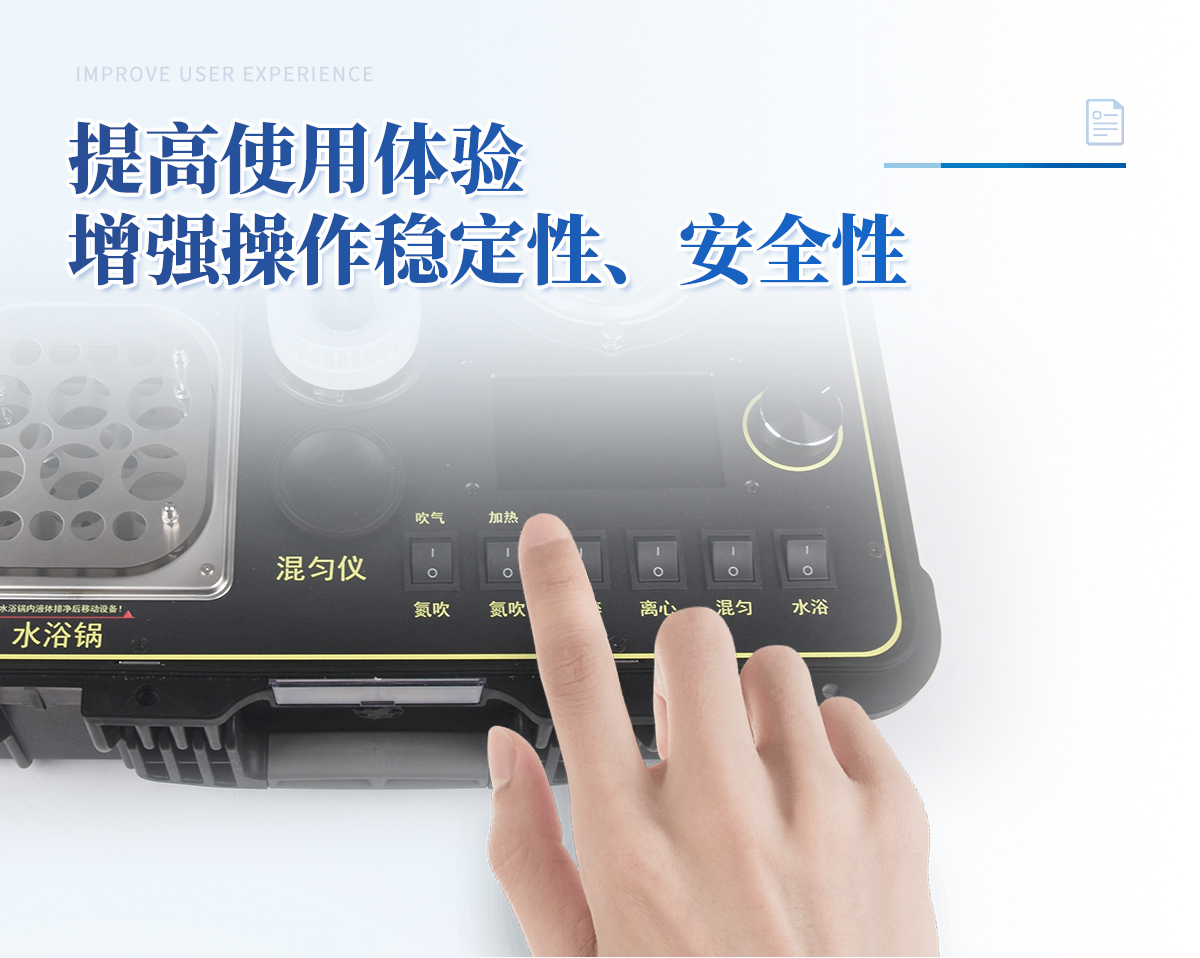 1、功能緊湊,集成五種樣品前處理常用的功能,完成樣品一站式處理。 | 2、結構穩固,機箱采用***工程塑料,具備**的抗沖擊性、耐腐蝕性、便攜性。 | 3、操作穩定,機器采用五寸全彩色液晶屏,功能指示性強,用戶操作均為實體開關,杜絕佩戴手套和液體噴濺時的操作失效。 |
