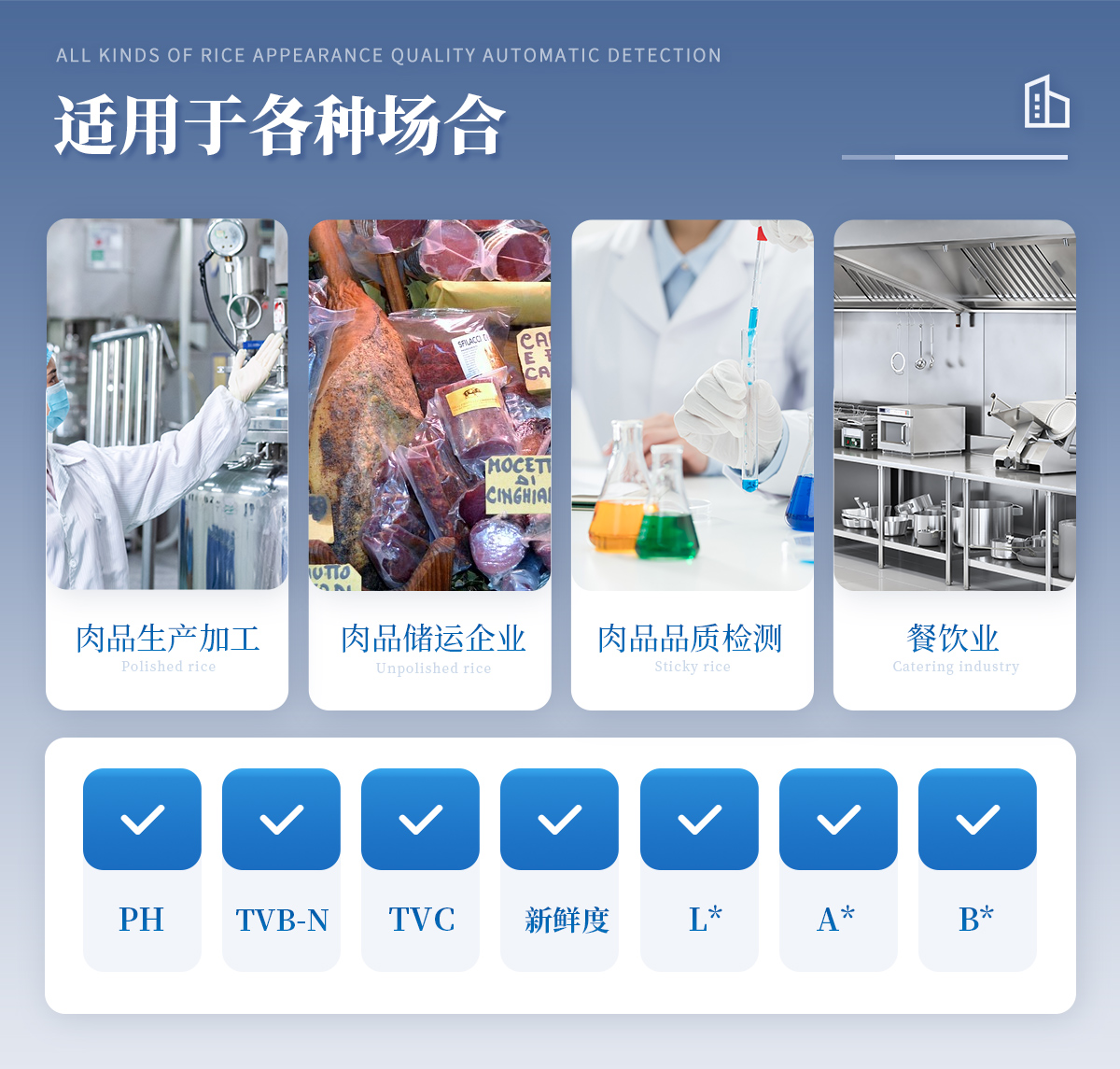 聯合中國農業大學彭彥昆教授團隊研發的掌上式生鮮肉新鮮度分析儀,可用于檢測生鮮肉的TVC、pH、TVB-N、新鮮度、L*、A*、B*等評價指標。Palmarter具有體積小、便 于攜帶、性價比高等特點,其應用場景包括但不限于肉儲運企業、肉品品質監管部門、飯店、超市、菜場、家庭等。