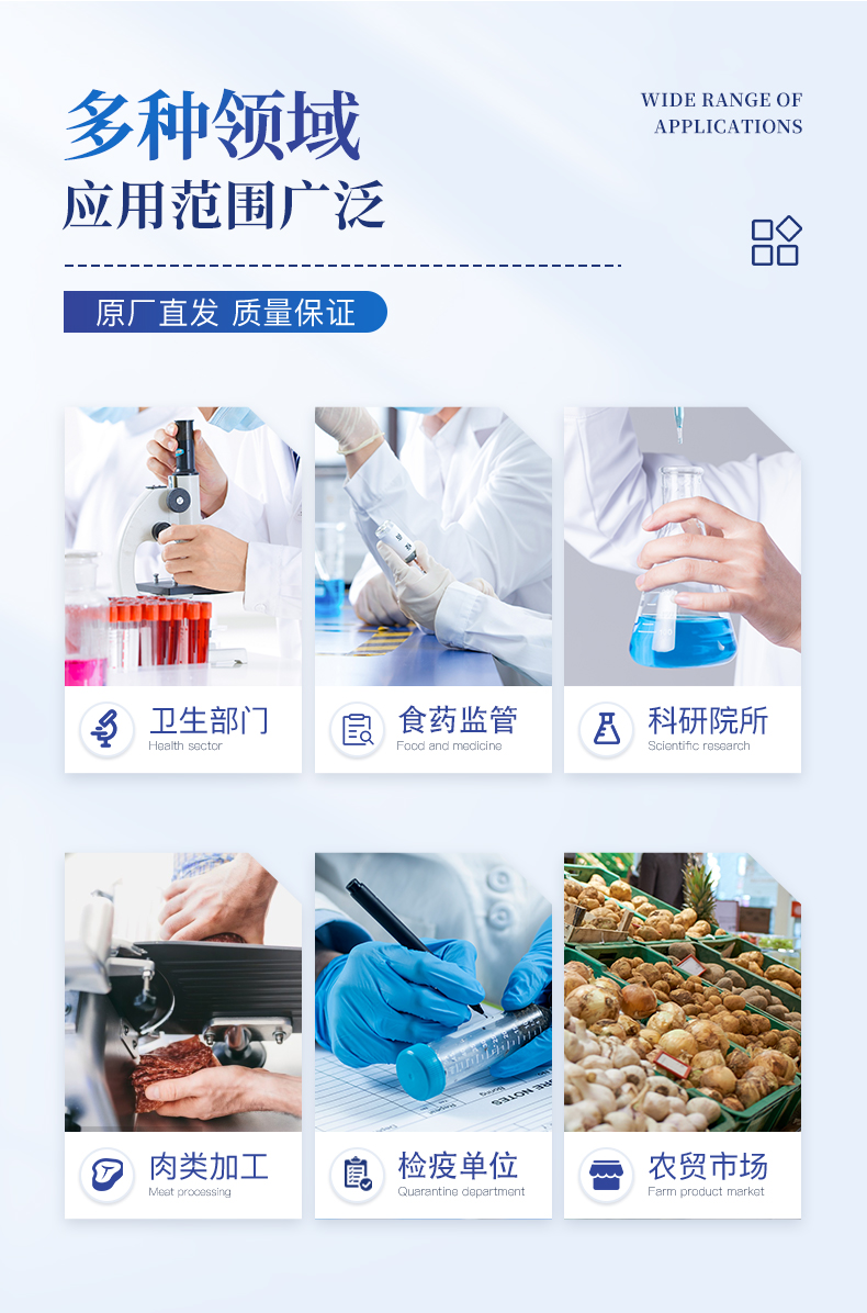 | 瘦肉精激素類(獸藥):鹽酸克倫特羅、沙丁胺醇、萊克多巴胺、己烯雌酚、喹乙醇等 | 抗生素殘留類(獸藥):四環素類、硝基呋喃類、磺胺類、沙星類、喹諾酮類、慶大霉素、鏈霉素、阿莫西林、紅霉素等 | 水產品安全類:孔雀石綠、氯霉素、呋喃妥因代謝、呋喃西林代謝、呋喃它酮代謝、呋喃唑酮代謝等 | 以及病害肉及肉類新鮮度的擴展檢測。 |