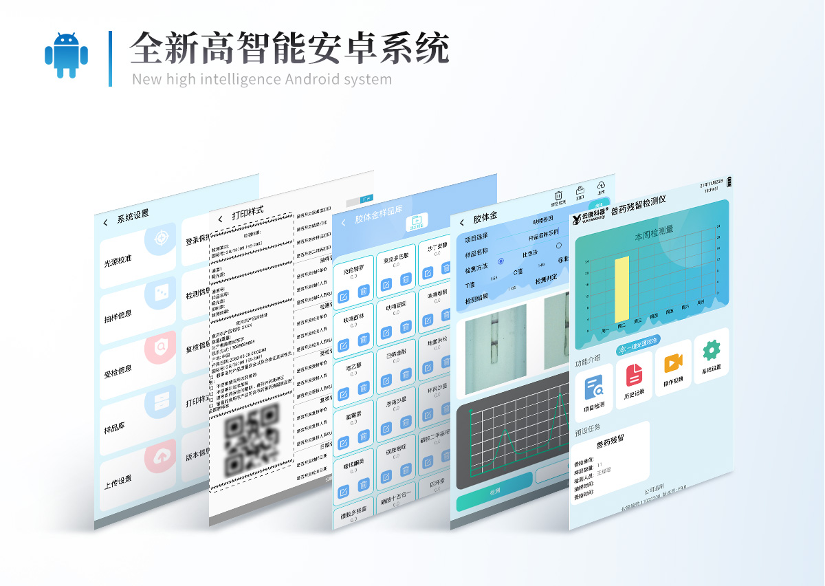 1、儀器采用10.1英寸液晶觸摸屏顯,搭配運行安卓智能操作系統,主控芯片采用ARM Cortex-A7,RK3288/4核處理器,主頻1.88Ghz,運轉速度更快速,性能更強。 | 2、儀器功能包括:膠體金檢測模塊、數字化管理模塊、無線通訊模塊等,可以滿足同一軟件下實現所有檢測項目的檢測,并在同一窗口展示檢測結果。 | 3.一體化便攜式快檢設備,采用交直流兩用供電方式,可連接車載電源,配備6ah大容量充電鋰電池,可以滿足現場及流動檢測使用的需求。儀器尺寸:43×35×20cm, 主機凈重:5.1kg | 4、系統自帶數據集成模塊,設備首頁自動統計檢測數據包含:周檢測數據、月檢測數據,全部檢測總數量,均包含檢測總數,合格數,不合格數,以及相關柱形分析圖,對各項檢測數據清晰掌握,無需電腦查詢,更加快捷直觀。 | 5、儀器具有任務預設模塊,可在樣品送檢前提前預設樣品名稱、檢測指標、送檢單位等信息,樣品送檢時一鍵調取保存信息,檢測更加方便快捷。 | 6、膠體金檢測模塊: | 軌道式自動傳輸掃描方式,可實時顯示金標卡實時圖像,系統自動分析并呈現出CT曲線圖,CT線自動識別,無需手動調整,完成檢測后自動退出檢測卡。 | 結果判定線可修改,對照值標定值可保存,斷電不丟失數據。 | 兼容市場上其他膠體金卡,使用耗材不受限制,極大增強用戶使用體驗。 | 7、儀器檢測系統擁有龐大數據庫,并且構建了完善的檢索、修訂功能。食品庫涵蓋多種樣品名稱,可按需添加或刪除、編輯樣品名稱;產品數據庫以及歷史檢測記錄支持一鍵檢索功能。 | 8、系統打印自定義化,打印格式多樣化,產品合格證(國家標準要求),二維碼,抽樣信息、檢測信息,受檢信息、復核信息、抽樣日期、檢測日期等信息結果,可按需求自行設置打印內容。 | 9、A4紙版本報告打印功能(可選配):設備擁有兩種結果展示方式,可以自動生成A4打印模板和小票打印模板兩種樣式,可通過WiFi及網線等方式鏈接外置打印機可進行打印 | 10、儀器具有 wifi 聯網上傳、RJ45網線連接功能,可以快速上傳數據。同步對接監管平臺,數據可局域網和互聯網數據上傳,檢測結果直接傳至食品安全監管平臺。進行區域食品安全監管及大數據分析處理與數據統計,檢測區域食品安全長短期動態,達到食品安全問題預估、預警。 | 11、設備支持U盤存儲,標準USB接口,免驅動安裝。檢測結果存儲容量20萬條以上,可生成Excel表格,進行一鍵拷貝,并具有登錄保護功能,可設置用戶名及密碼,規范不同人員操作權限,防止非工作人員操作,并且可以進行重新校準、鎖定、恢復出廠設置功能。儀器固件可升級,后期檢測項目可擴充。 | 12、儀器具備遠程升級功能,可定向分客戶分儀器更新,開機后自動更新,并可持續性免費更新系統版本,無需像傳統產品返廠更新,節省時間及人力成本并避免了物流運輸返廠升級導致設備損壞的潛在風險。 |