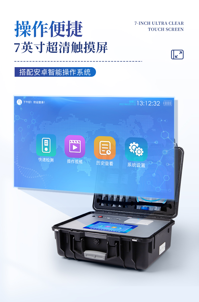 6、一體化便攜式快檢設(shè)備,滿足現(xiàn)場(chǎng)及流動(dòng)檢測(cè)使用需求,能夠在同一軟件下實(shí)現(xiàn)所有檢測(cè)項(xiàng)目的檢測(cè),并可通過同一窗口直觀顯示檢測(cè)結(jié)果。