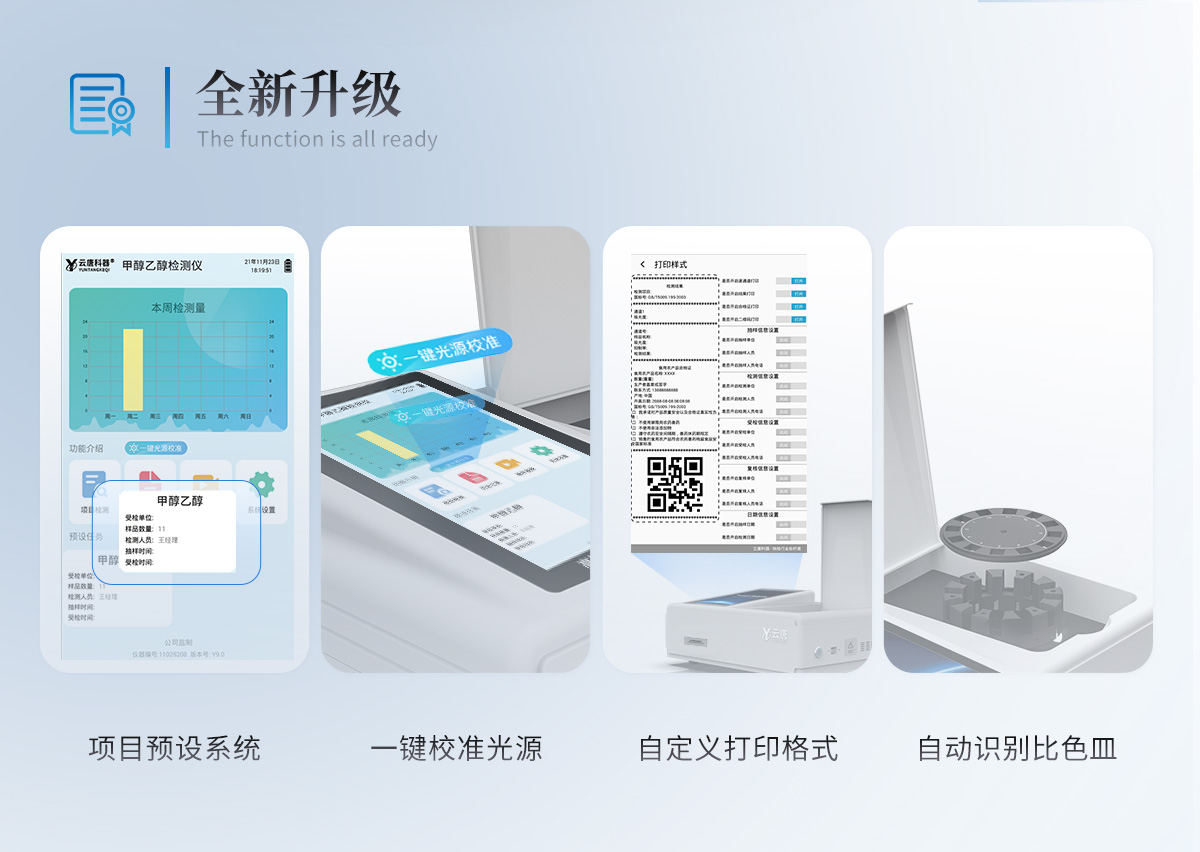儀器采用臺式一體化系統檢測技術,將分光光度模塊、新型農殘檢測模塊、數字化管理模塊、無線通訊模塊高度集成于一體,支持檢測200種食品安全檢測項目,同時預留升級檢測方法。 | 儀器檢測模塊標準化、智能化,可隨意自由組合。檢測箱體內置多個標準檢測單元,檢測模塊可以調整配置。 | 儀器采用全新安卓智能系統,主控芯片采用 ARM Cortex-A7,RK3288/4核處理器,10.1寸高清液晶觸摸豎屏,更加**的UI交互界面,運轉快捷;儀器配備無線通信模塊: 4G(APN)通訊模塊、Wifi模塊,藍牙傳輸,同時具有雙USB接口以及RJ45接口能以多種方式實現數據保存和數據傳輸功能。 | 創新檢測模式: | ★檢測通道:≥12通道;采用精密旋轉比色池設計,使用同芯片同光源校準精度,解決不同光源之間的誤差值。1-12通道間誤差0.1%。(***:**202022821055.2) | ★儀器具有自動識別比色皿檢測功能,即:將樣品比色皿放入儀器后,點擊樣品檢測,儀器自動識別比色皿進行通道檢測。 | 進口高精光源: | 高精度進口四波長冷光源,通道配置 410、520、590、630nm 波長光源,一個光源芯片驅動一個光源,誤差極小,每臺設備單獨**校準光源,**比對,同時參照四種不同波段光源全方位覆蓋市面上99%的農殘食品項目檢測。 | 智能化操作系統: | 便捷操作系統:設備檢測時可在同一檢測界面自動對應相關檢測通道一次性選擇1-12個樣品名稱,無須退出界面,節省操作時間。 | 數據集成系統:設備首頁自動統計檢測數據包含:周檢測數據、月檢測數據,全部檢測總數量,均包含檢測總數,合格數,不合格數,以及相關柱形分析圖,對各項檢測數據清晰掌握,無需電腦查詢,更加快捷直觀。 | 項目預設系統:支持添加單個及多個相同或不相同的任務預設,一鍵快速調取,每一個任務分別可以設置不同的樣品、批次、編號、來源、備注、抽樣信息、檢測信息、受檢信息、復核信息等更多信息。無縫鏈接平臺和APP實時查看下發任務。 | 數據監管系統:同步對接監管平臺,數據可局域網和互聯網數據上傳,檢測結果可選擇直接傳至食品安全監管平臺。集成OSS輸出存儲服務、區分設備定向管理應用,進行區域食品安全監管及大數據分析處理與數據統計,檢測區域食品安全長短期動態,達到食品安全問題預估、預警。 | 自定義打印系統:內置全新打印系統,新創自定義打印方式,可按需靈活設置開啟或關閉:產品合格證(國家農業部標準要求),二維碼,抽樣信息、檢測信息,受檢信息、復核信息、抽樣日期、檢測日期等信息的打印。 | 系統遠程更新功能:可定向分客戶分儀器更新系統,按照不同客戶后期實際需求添加項目,無需機器返廠,即可遠程實時升級全新系統,節省時間成本及避免運輸造成設備損壞。 | 儀器主機采用一體化防水、抗壓、防撞擊、防腐蝕箱體設計,同時配備交直流供電,可連接車載電源,可選配大容量充電鋰電池,滿足現場野外檢測需求。 | 安全證書,放心保障:儀器具有中國計量科學研究院校準證書,權威認證。 |
