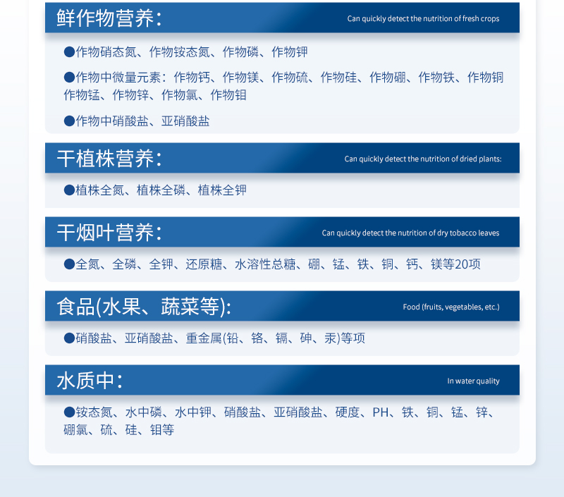 ●作物硝態氮、作物銨態氮、作物磷、作物鉀; ●作物中微量元素:作物鈣、作物鎂、作物硫、作物硅、作物硼、作物鐵、作物銅、作物錳、作物鋅、作物氯、作物鉬; ●作物中硝酸鹽、亞硝酸鹽。 |