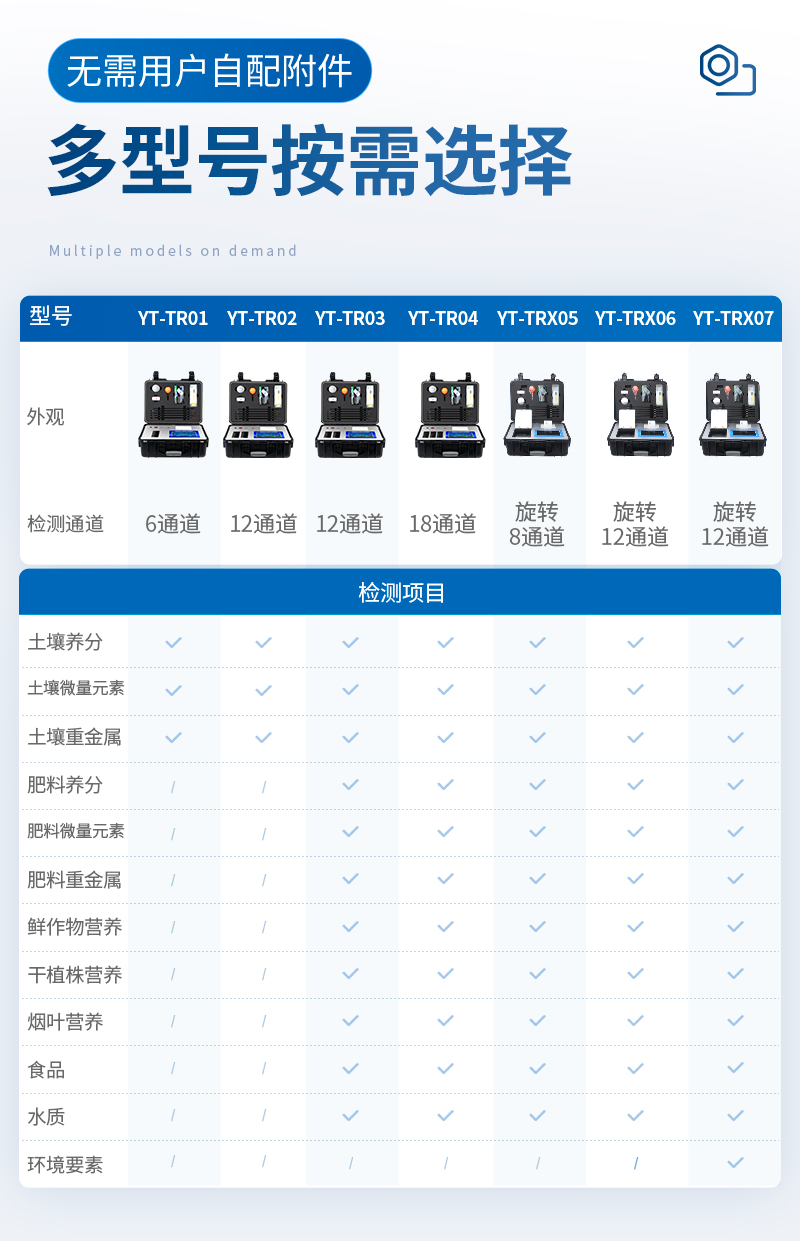 ●土壤銨態氮、土壤有效磷、土壤速效鉀、土壤硝態氮、土壤水解氮、土壤全氮、土壤全磷、土壤全鉀、土壤有機質(丘林法)、土壤有機質(浸提法)、土壤總有機碳、土壤碳氮比、PH值、含鹽量、水分。 ●土壤中微量元素:土壤鈣、土壤鎂、土壤硫、土壤硅、土壤硼、土壤鐵、土壤銅、土壤錳、土壤鋅、土壤氯、土壤鉬; ●土壤重金屬:土壤鉛、土壤砷、土壤鎘、土壤鉻、土壤汞、土壤鎳、土壤鋁、土壤氟、土壤鈦、土壤硒。 |