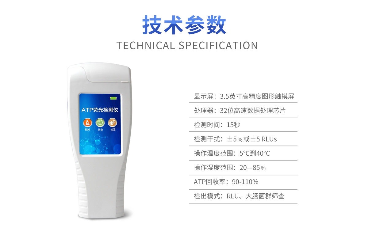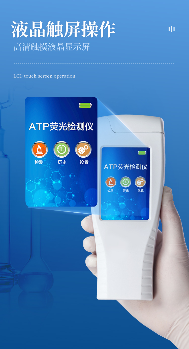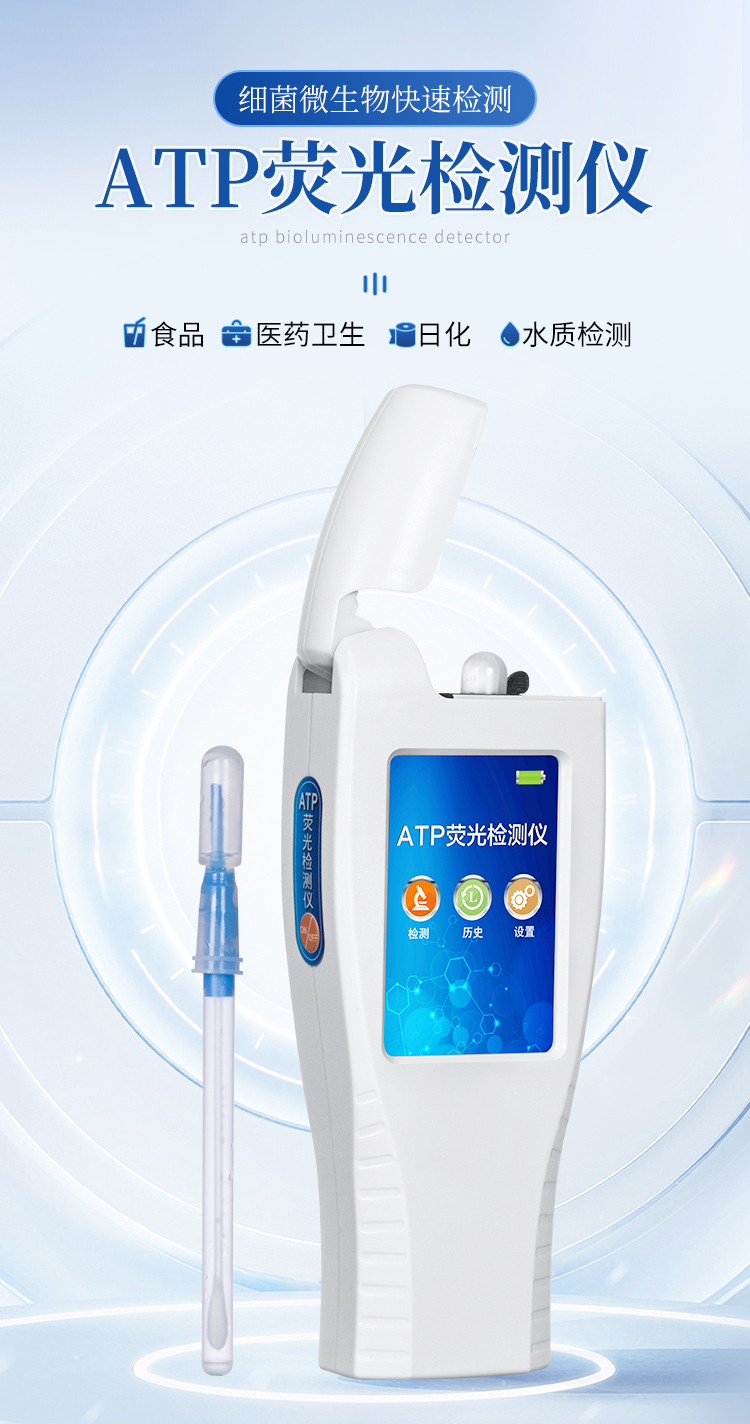 該儀器可快速檢測各種水質中微生物、細菌含量。設備為全新升級產品,大屏幕觸摸顯示屏,代替傳統按鍵。操作采用生物化學反應方法檢測ATP含量,ATP熒光檢測儀基于螢火蟲發光原理,利用“熒光素酶—熒光素體系”快速檢測三磷酸腺苷(ATP)。ATP拭子含有可以裂解細胞膜的試劑,能將細胞內ATP釋放出來,與試劑中含有的特異性酶發生反應,產生光,再用熒光照度計檢測發光值,微生物的數量與發光值成正比,由于所有生物活細胞中含有恒量的ATP,所以ATP含量可以清晰地表明樣品中微生物與其他生物殘余的多少,用于判斷衛生狀況。