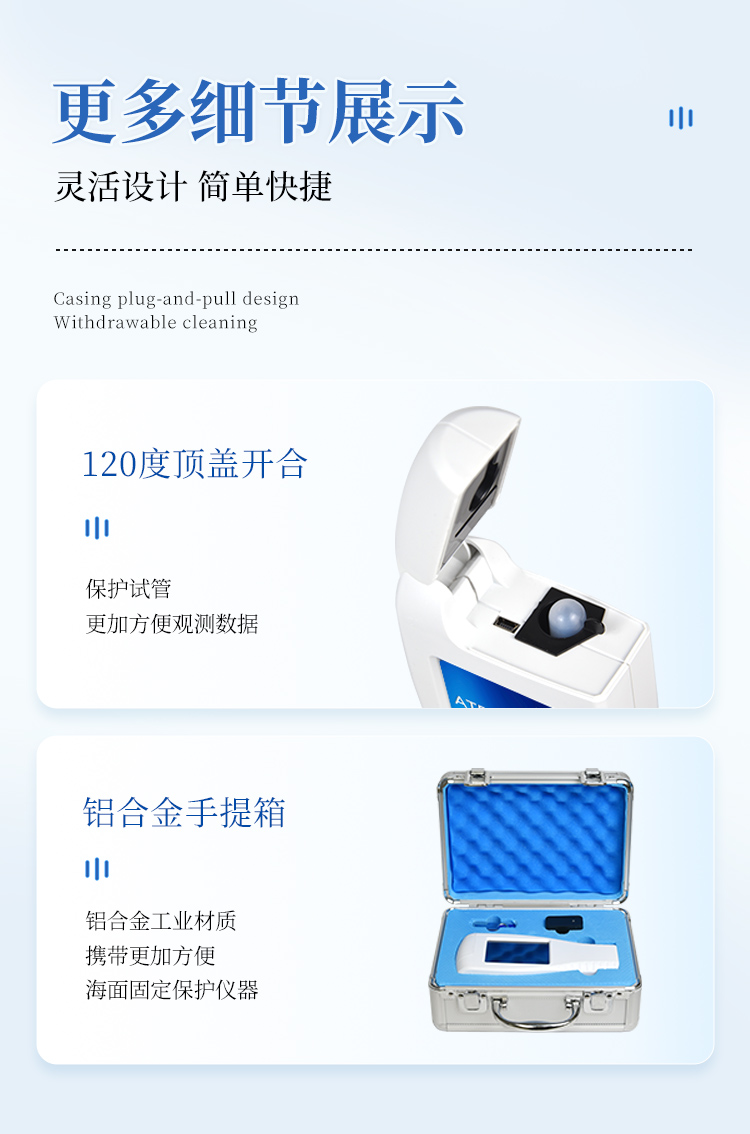 體驗更好 —— 試子套管采用插拔式靈活設計,可定期清洗長期使用,延長儀器壽命。