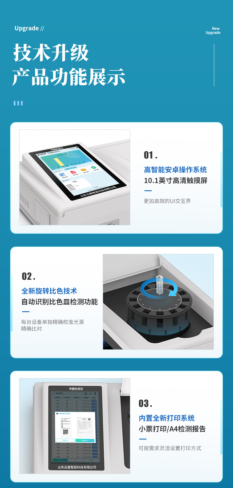 儀器采用手提箱一體化設計,將分光光度模塊、膠體金檢測模塊、新型農殘檢測模塊、數字化管理模塊、無線通訊模塊高度集成于一體,同時預留升級檢測方法,可遠程進行升級系統。 | 儀器檢測模塊標準化、智能化,檢測項目可隨意自由組合。檢測箱體內置多個標準檢測單元,檢測模塊可以調整配置。 | 顯示屏幕:儀器采用10.1英寸豎向液晶觸摸屏顯,搭配運行安卓智能操作系統,主控芯片采用ARM Cortex-A7,RK3288/4核處理器,主頻1.88Ghz,操作方便,性能更強。 | 檢測通道:≥12通道;采用精密旋轉比色池設計,使用同芯片同光源校準精度,解決不同光源之間的誤差值,更加準確**。(1-12通道間誤差0.1%,***:**202022821055.2) | 儀器光源:高精度進口四波長冷光源,每個通道均配置 410、520、590、630nm 波長光源,標配**的光路切換裝置,專利光路切換功能可實現64波長,并且所有檢測項目可實現所有通道同時檢測。 | 設備可一鍵校準,自動保存校準數據,自動對比校驗,得到精準光源,采用Android SP存儲數據,光源數據永不丟失,方便每一次使用。 | 通訊接口:配備無線通信模塊、4G(APN)通訊模塊、藍牙傳輸,同時具有雙USB接口以及RJ45網線接口,可以多方式實現數據保存及數據傳輸。 | 存儲方式:支持U盤存儲,標準USB接口,免驅動安裝。檢測結果存儲容量20萬條以上,可生成Excel表格進行拷貝,并具有登錄保護功能。 | 操作系統:儀器可在同一檢測界面自動對應相關檢測通道,一次性選擇1-12個樣品名稱,無需退出界面,節省操作時間。并可以對每個通道屬性和樣品信息單獨進行編輯,例如送檢單位、人員,檢測人員等,打印時勾選打印顯示。 | 數據集成系統:設備首頁自動匯總分析檢測數據,包含:周檢測數據、月檢測數據,全部檢測總數量,包含檢測總數,合格數,不合格數,以及相關柱形分析圖,各項檢測數據一目了然,無需電腦查詢,更加快捷直觀。 | 數據庫系統:十幾項數據庫分類管理儀器:包含項目類型、項目數據、檢測數據、歷史記錄、國標信息、曲線信息、采樣信息、檢測信息、受檢信息、復核信息、圖表信息、光源校準信息、打印樣式信息、樣品庫信息等等,數據庫之間互相協調聯動保證數據的真實完整性。同時產品數據庫以及歷史檢測記錄支持一鍵檢索功能。 | 限量規判系統:具有限量查詢、添加物質合規判定系統。檢測出結果后,系統自動調用系統數據庫中相關國標進行比對判定,客觀顯示判定結果是否合格。 | 項目預設系統:儀器具有任務預設模塊,一鍵提前預設,給出方便快捷的新檢測方案,每一個任務分別可以設置不同的樣品、批次、編號、來源、備注、抽樣信息、檢測信息、受檢信息、復核信息等更多信息。樣品送檢時一鍵調取保存信息,并可多次調取,大大提高檢測效率。 | 數據監管系統:同步對接監管平臺,數據可局域網和互聯網數據上傳,檢測結果可直接傳至食品安全監管平臺。進行區域食品安全監管及大數據分析處理與數據統計,監測區域食品安全長短期動態及問題預估、預警。 | 全新打印系統:內置全新打印機,新創自定義打印方式,可按需靈活勾選控制:產品合格證(國家農業部標準要求),二維碼,抽樣信息、檢測信息,受檢信息、復核信息、抽樣日期、檢測日期等信息的打印。 | A4紙版本報告打印功能(可選配):設備擁有兩種結果展示方式,可以自動生成A4打印模板和小票打印模板兩種樣式,可通過WiFi及網線等方式鏈接外置打印機可進行打印。 | 供電模式:儀器交直流兩用,直流12V供電,可連接車載電源,配6ah大容量充電鋰電池,電量可實時顯示,方便戶外流動測試。 | 膠體金檢測模塊:采用CMOS成像處理技術及膠體金免疫層析技術,可讀取膠體金卡數據,自動采集、處理分析,將檢測結果顯示,并可根據參考限值自動判斷檢測結果,可檢測常見的獸藥殘留、生物毒素、抗生素、違禁添加物等。 | 探測技術:CMOS成像探測; | 檢測通道:1個通道; | 檢測方式:消線法和比色法; | 顯示模式:陰性或陽性; | 曲線形式:軌道式掃描方式,顯示金標卡圖像,實時生成、識別CT曲線圖,無需手動調整,完成檢測后自動退出檢測卡。兼容市場上其他金標卡,使用耗材不受限制。 | 儀器具備遠程升級功能,可定向分客戶分儀器更新,開機后自動更新,并可持續性免費更新系統版本,無需像傳統產品返廠更新,節省時間及人力成本并避免了物流運輸返廠升級導致設備損壞的潛在風險。 |