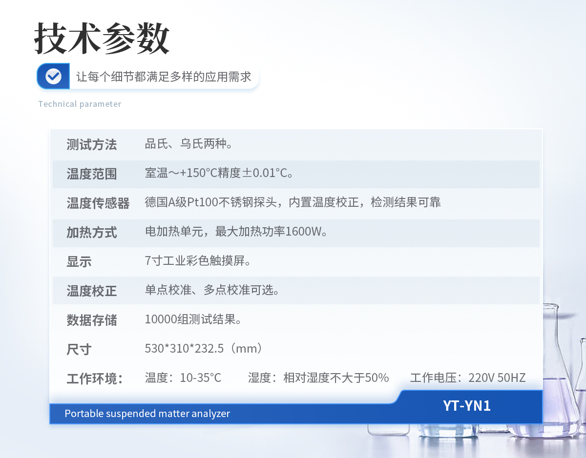 測試方法:品氏、烏氏兩種。 | 溫度范圍:室溫~+150°C精度±0.01°C。 | 溫度傳感器:德國A級Pt100不銹鋼探頭,內置溫度校正,檢測結果可靠。 | 加熱方式:電加熱單元,**加熱功率1600W。 | 顯示:7寸工業彩色觸摸屏。 | 溫度校正:單點校準、多點校準可選。 | 數據存儲:10000組測試結果。 | 尺寸:530*310*232.5(mm) | 工作環境: | 溫 度:10-35℃ | 濕 度:相對濕度不大于50% | 工作電壓:220V 50HZ |