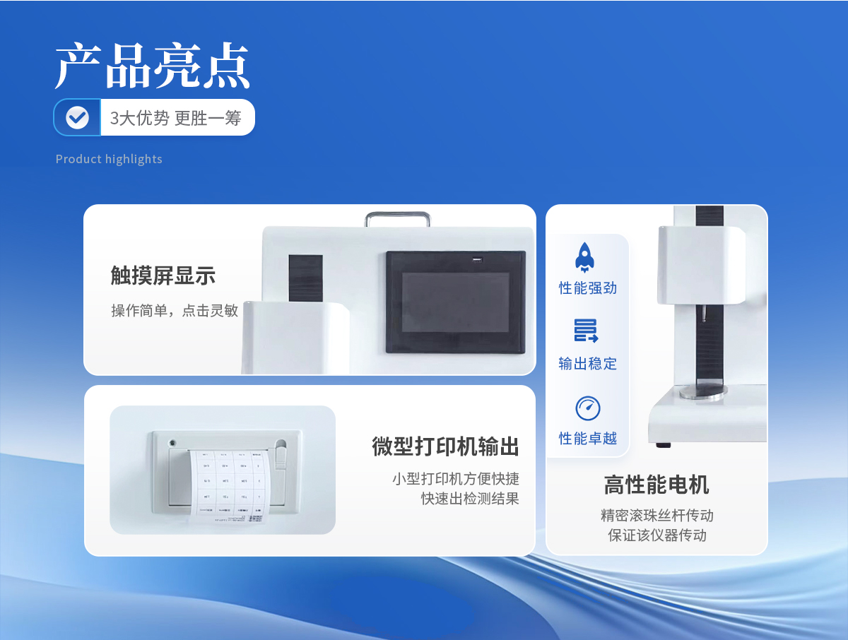 1、采用芯片控制,高精度測力傳感器,精度高。 | 2、采用高性能電機,滾珠絲桿傳動,保證該儀器傳動。 | 3、大觸摸屏中文顯示,友好人機界面操作。全自動完成測試。操作方便,具有測試數據統計處理功能,微型打印機輸出。 |