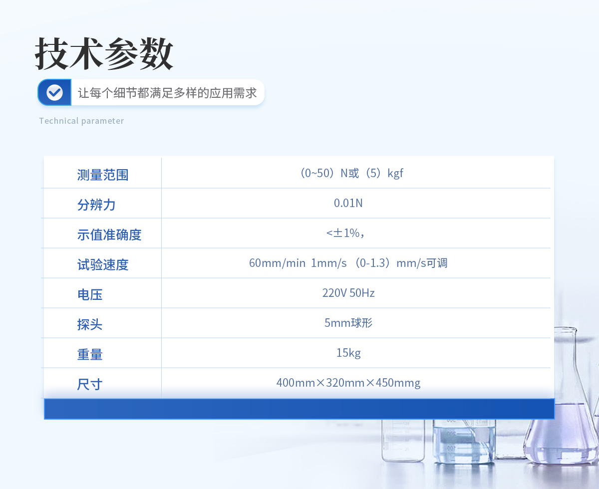 測量范圍:(0~50)N或(5)kgf | 分辨力:0.01N | 示值準確度:<±1% | 試驗速度:60mm/min 1mm/s (0-1.3)mm/s可調 | 電壓:220V 50Hz | 探頭:5mm球形 | 單位:g.cm | 重量:15kg | 尺寸:400mm×320mm×450mm |