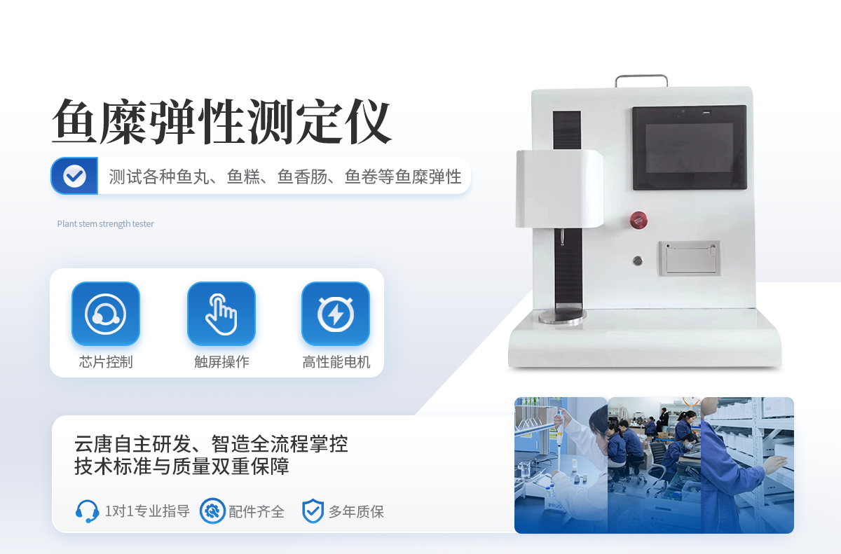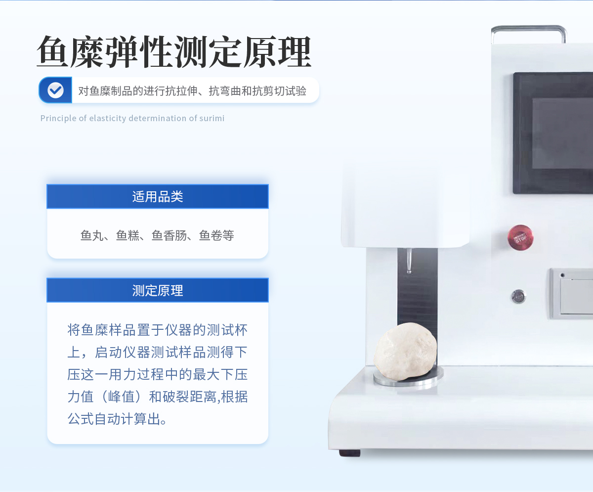 魚糜彈性測定儀是適用于各種魚丸、魚糕、魚香腸、魚卷等魚糜彈性的測試儀器。該機也叫質構儀,魚糜物性測試儀,魚糜凝膠強度測試儀 魚糜系以魚肉為原料,將魚肉粉碎,加食鹽、副原料等進行擂潰,成粘稠的魚肉糊再成型后加熱,變成具有彈性的凝膠體, 魚糜彈性對一定形狀和尺寸魚糜制品的進行抗拉伸、抗彎曲和抗剪切試驗,衡量魚糜質量的一項重要指標。 魚糜彈性測定儀滿足國家標準《GBT36187-2018冷凍魚糜凝膠強度測定》