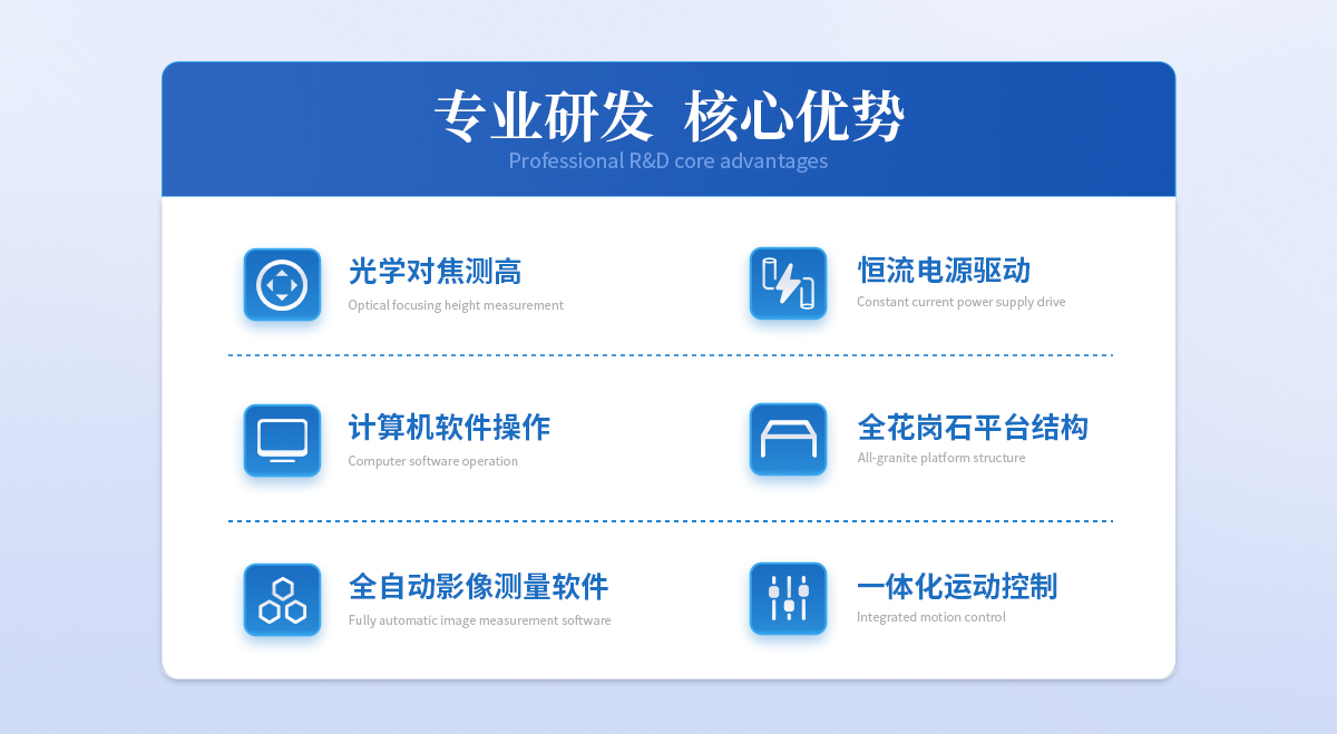 1、智慧燈光:鼠標單擊對應的圖標,軟件自動調節合適的燈光亮度。使用過程中方便、**。 | 2、測量宏功能:將一連串的測量構造命令關聯到一個按鈕上,點擊按鈕,即開始執行宏測量功能,宏測量功能會自動完成構造動作,減少用戶操作鼠標次數,提高工作效率。 | 3、導入CAD圖紙測量:設置跟圖紙一致的坐標系,調節好燈光,導入圖紙及完成編程步驟。對于平面尺寸測量非常**。 | 4、計算器功能:測量過程中會遇到不能直接通過測量得出的數據。軟件這里提供了一些基本表達式:絕對值、三角函數、反三角函數、平均值、**值、*小值、開平方、iF表達式等。 | 5、SPC功能:專業的 SPC 軟件,測量軟件和SPC 軟件無縫鏈接, 自動將數據導入 SPC 數據庫,其圖 表及數據可打印和導入到 EXCEL 表格 | 6、3D測量功能:需加裝選配探針或點激光 |