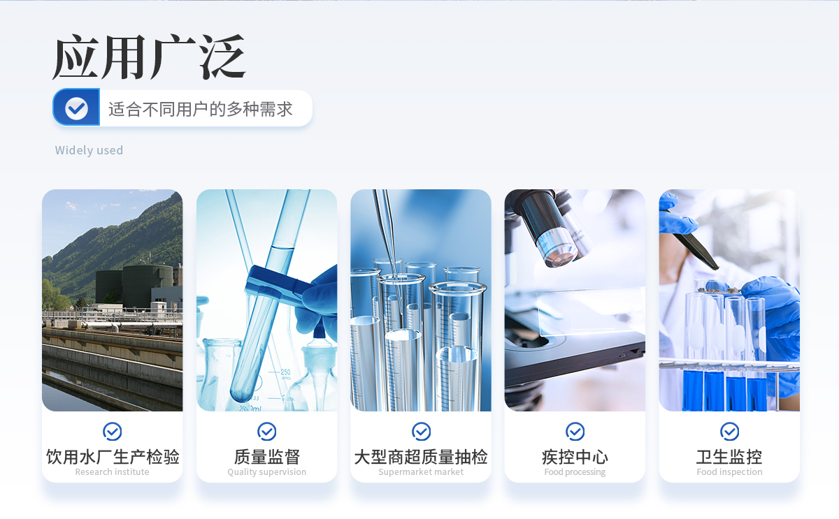 能夠廣泛的應用于飲用水廠生產檢驗、市場監督部門質量監督、大型商超質量抽檢、疾病控制中心、衛生監控等。