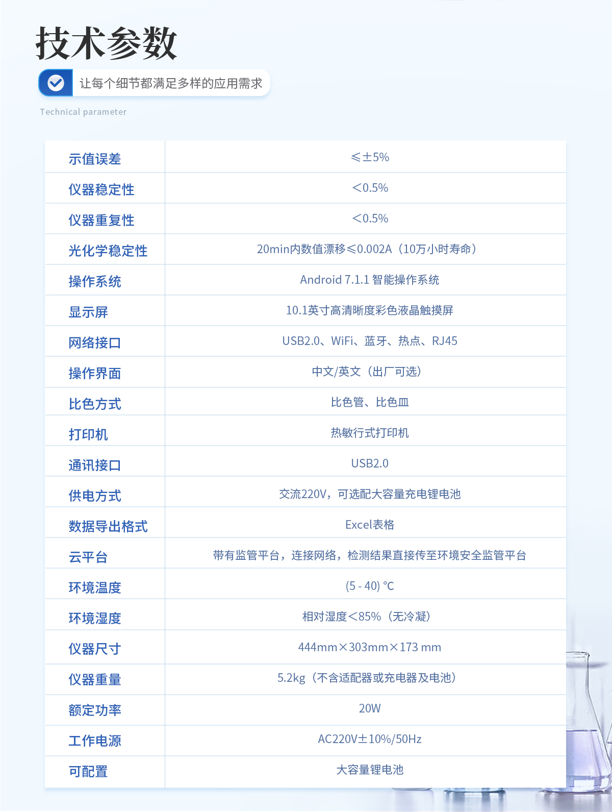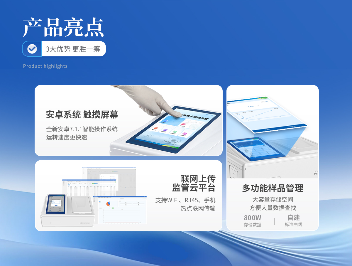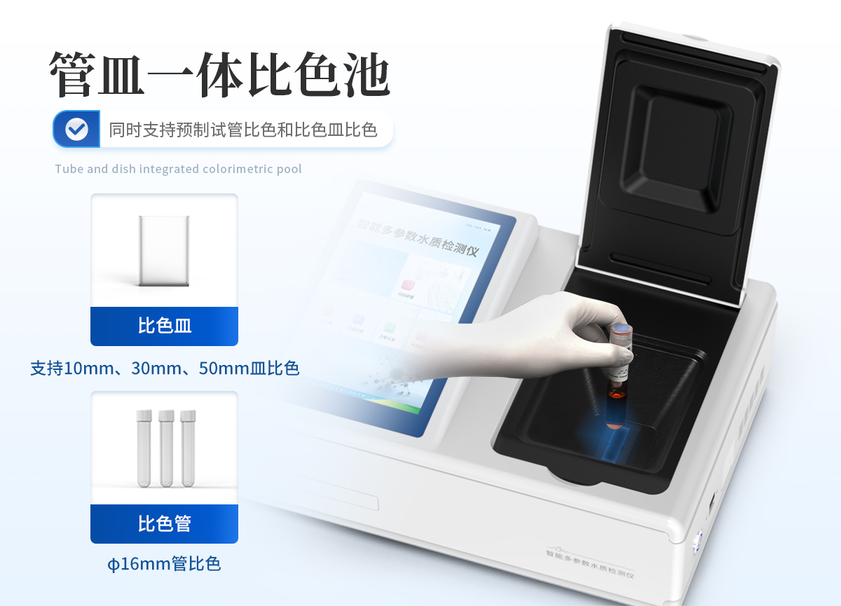 1、采用全新安卓7.1.1智能操作系統,人性化中文操作界面,運轉速度更快速,穩定性更強。 | 2、10.1英寸液晶觸摸屏顯示,人性化中文操作界面,讀數直觀、簡單。 | 3、采用精密比色池設計,使用光源一致,可以解決由于光源誤差帶來的檢測結果誤差問題,檢測結果更加精準。 | 4、光源采用進口超高亮發光二極管,光源亮度可以自動調節與校準。 | 5、支持10mm、30mm、40mm、50mm皿比色和φ16mm管比色等比色方式,多元選擇,確保測量的準確性; | 6、具有無線通訊功能,支持WIFI、RJ45、手機熱點聯網傳輸,檢測數據亦可通過U盤導出; | 7、多功能樣品管理,可對樣品進行中英文命名,方便樣品記錄和數據存儲; | 8、儀器可永久存儲800萬組數據,為方便大量數據查找,可通過時間檢索,并隨意選擇分析; | 9、支持HDMI輸出,方便用戶培訓、講解、及大屏展示。 | 10、儀器帶有監管云平臺,數據可通過局域網和互聯網上傳,亦可對接上傳至環境監管部門平臺。 | 11、內置熱敏行式打印機,打印紙上的內容可自由選擇(包括二維碼打印); | 12、交流220V,可選配6ah大容量充電鋰電池,方便戶外流動測試; | 13、內置教學演示視頻,用戶可一邊看儀器內操作視頻,一邊進行實驗操作,更易上手。 | 14、后期產品固件可升級。 |