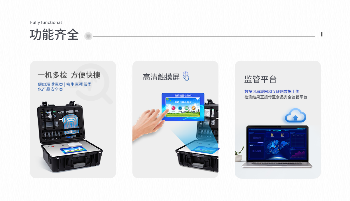 安卓智能操作系統,采用更加**UI交互界面,儀器具有wifi聯網上傳、4G聯網傳輸、GPRS無線遠傳、網線連接功能,快速批量上傳數據。智能化程度高,儀器具有自檢功能:具有開機自檢和調零功能,具有自動檢測重復性功能。新一代高速熱敏打印機,檢測完成可自動打印檢測報告和二維碼。儀器帶有監管平臺,數據可局域網和互聯網數據上傳,檢測結果直接傳至食品安全監管平臺。進行區域食品安全監管及大數據分析處理與數據統計,檢測區域食品安全長短期動態,達到食品安全問題預估、預警一體化主機,包含食品安全檢測模塊、多通道農藥殘留檢測模塊、膠體金免疫層析檢測模塊。一體化便攜式快檢設備,滿足現場及流動檢測使用需求,能夠在同一軟件下實現所有檢測項目的檢測,并可通過同一窗口直觀顯示檢測結果。膠體金模塊檢測方式:軌道式自動傳輸掃描,檢測完成后自動退出檢測卡。CT線自動識別,無需手動調整。儀器具有品類多種類樣品菜單庫,可靈活選擇檢測樣品,不同的檢測通道可同時檢測不同的樣品項目。樣品處理簡單省力,整體操作快速、安全、便捷。儀器具有自身保護功能,可設置用戶名及密碼,防止非工作人員操作等。高靈敏度,高檢測精度,高重復性精度,掃描式高精度光學傳感器。內置強大的數據庫,可在儀器上直接選擇樣品名稱、檢測指標、送檢單位等信息,也可在儀器上直接編輯錄入樣品名稱、檢測指標、送檢單位等信息并保存進樣品數據庫。儀器具有重新校準、鎖定、恢復出廠設置功能。結果判定線可修改,對照值標定值可保存,斷電不丟失數據。兼容市場上所有的膠體金卡,使用耗材不受限制,極大增強用戶使用體驗。