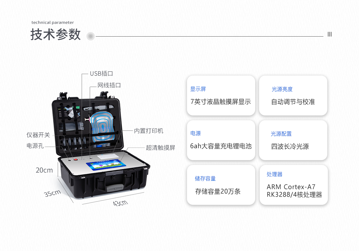 主控芯片采用ARM Cortex-A7,RK3288/4核處理器,主頻1.88Ghz,運轉速度更快速,穩定性更強。顯示方式:7英寸液晶觸摸屏顯示,人性化中文操作界面,讀數直觀、簡單。交直流兩用,直流12V供電,可連接車載電源,可配6ah大容量充電鋰電池,方便戶外流動測試。四波長冷光源,每個通道均配置410、520、590、630nm波長光源,標配**的光路切換裝置,專利光路切換功能可實現*多64波長,并且所有檢測項目可實現所有通道同時檢測。光源亮度自動調節與校準智能恒流穩壓,光強自動校準,長時間連續工作光源無溫漂現象。內置新國家限量標準,與所測結果進行現場比對,并持續更新標準。不間斷進樣,連續檢測樣本編號自動累加。數據無線上傳平臺,并可從平臺導出為Excel表格。檢測結果存儲容量20萬條同時支持U盤拷貝,標準USB接口,免驅動插拔。檢測項目可擴充,固件可升級儀器尺寸:43×35×20cm, 主機凈重:5.2kg