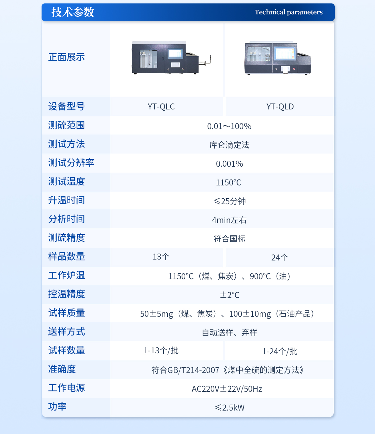 測(cè)硫范圍:0.01~100%測(cè)試方法:庫(kù)侖滴定法測(cè)試分辨率:0.001%測(cè)試溫度:1150℃升溫時(shí)間:≤25分鐘分析時(shí)間:4min左右測(cè)硫精度:符合國(guó)標(biāo)樣品數(shù)量:24個(gè)工作爐溫:1150℃(煤、焦炭)、900℃(油)控溫精度:±2℃試樣質(zhì)量:50±5mg(煤、焦炭)、100±10mg(石油產(chǎn)品)送樣方式:自動(dòng)送樣、棄樣試樣數(shù)量:1-24個(gè)/批,試驗(yàn)過(guò)程可添加/替換試樣準(zhǔn)確度:符合GB/T214-2007《煤中全硫的測(cè)定方法》工作電源:AC220V±22V/50Hz  功率:≤2.5kW